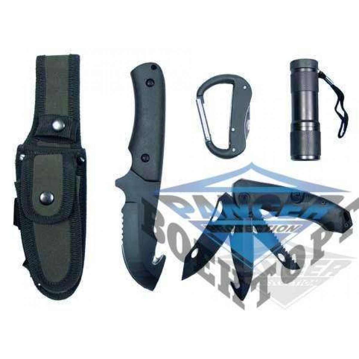 Ніж підходить для полювання, риболовлі та туристичних походів. Головною перевагою комплекту є його компактність і вага. В комплекті: а) ніж для дичини і риби; б) складаний ніж з 3 лезами (з пилкою, ніж зі стропорезом і прямої ніж); в) ліхтарик з 9 світлодіодами; г) карабін з мультитулом. Матеріал: загартована сталь 420; Виробник: MFH