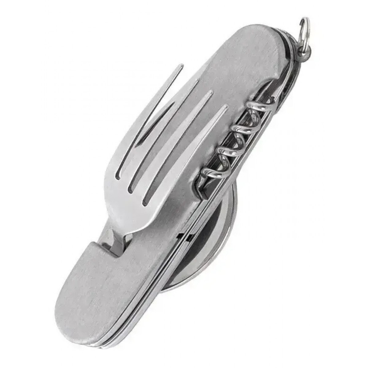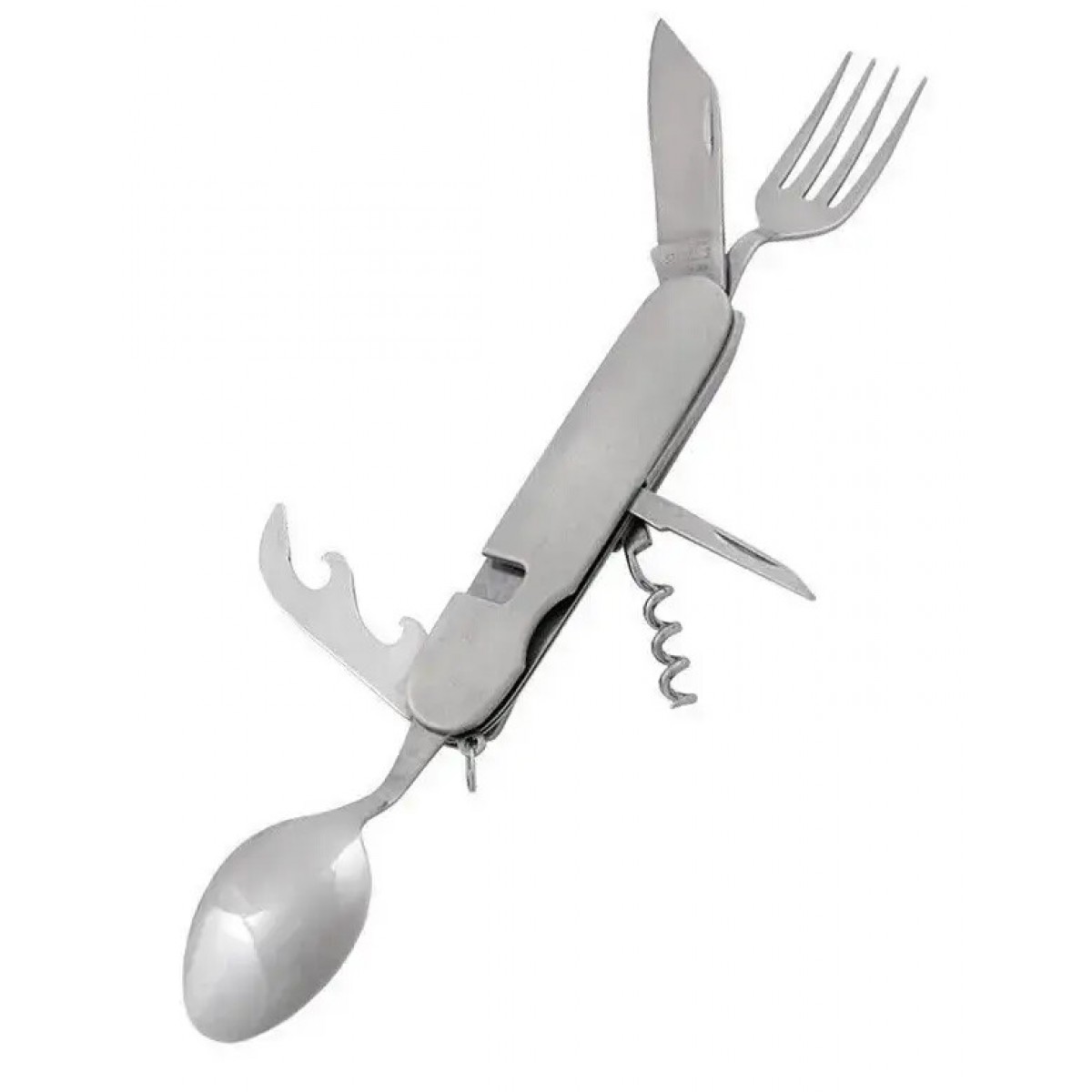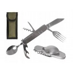 - Багатофункціональний пристрій - набір 6-в-1. Крім ложки з виделкою, включає відкривачку консервів і пляшок, штопор і столовий ніж, у якого явно виражений скіс обуха для зручного проколювання чого-небудь. Всі вироби полегшеного типу, але при цьому нормальних розмірів. Ними комфортно їсти перші і другі страви, готувати їжу.