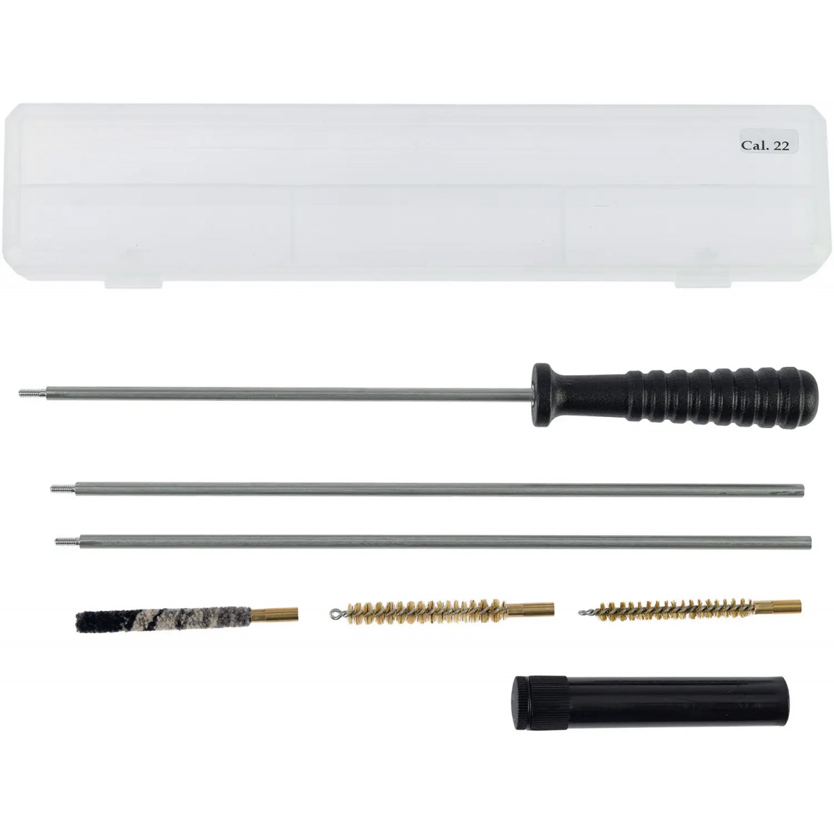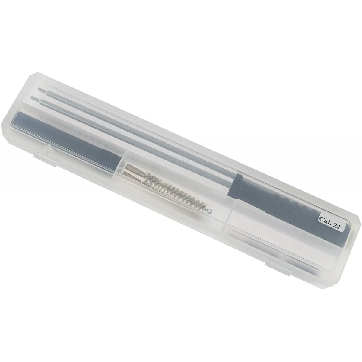 Набір для чищення MegaLine для нарізної зброї калібру.22. В комплект входять: складаний алюмінієвий шомпол (3 секції), латунний йоржик, нейлоновий йоржик, пухівка, маслянка. Набір постачається в зручній пластиковій коробці.