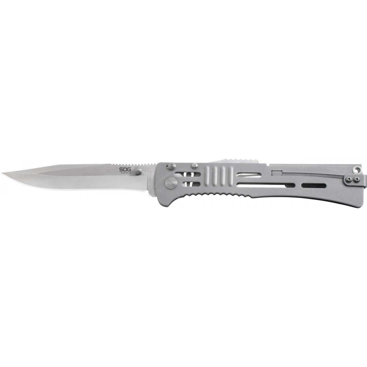 Клинок виготовлений з високоякісної сталі AUS-8, легко витягується однією рукою за допомогою шпенька завдяки технології прискореного відкривання (SOG ASSISTED TECHNOLOGYTM) і надійно фіксується замикаючим механізмом бэклок. Накладки рукоятки виконані з нержавіючої сталі. Є двостороння кишенькова кліпса глибокого носіння.