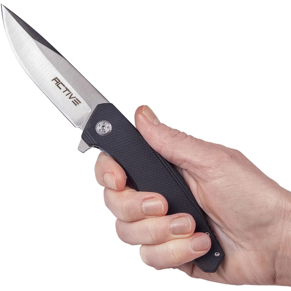 Клинок профілю Clip Point виконаний із недорогої сталі марки 3Cr13, яка відрізняється хорошими показниками корозійної стійкості, а також простотою виправлення різальної кромки. Витягується клинок за допомогою фліпера і надійно фіксується у робочому положенні сталевою пластиною замка Liner Lock. Ніж обладнаний системою шарикопідшипників, що сприяє легкому та плавному витягуванню клинка. Прямі спуски починаються майже з 1/3 від обуха, що у поєднанні з формою клинка забезпечує ножу хороші колючі та різальні якості.