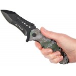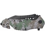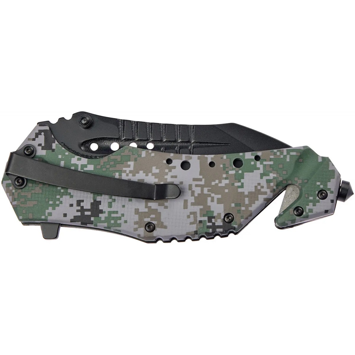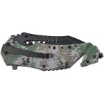 Накладки на рукоять виконані з алюмінієвого сплаву з чіпкою насічкою та пофарбовані в патерн камуфляжу "піксель". Присутній склобій, а також сталева кліпса для перенесення ножа в положенні Tip-down.