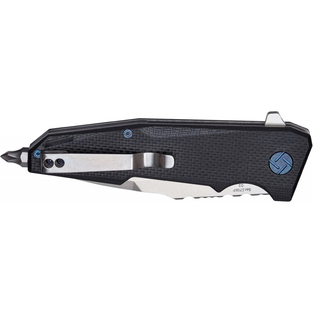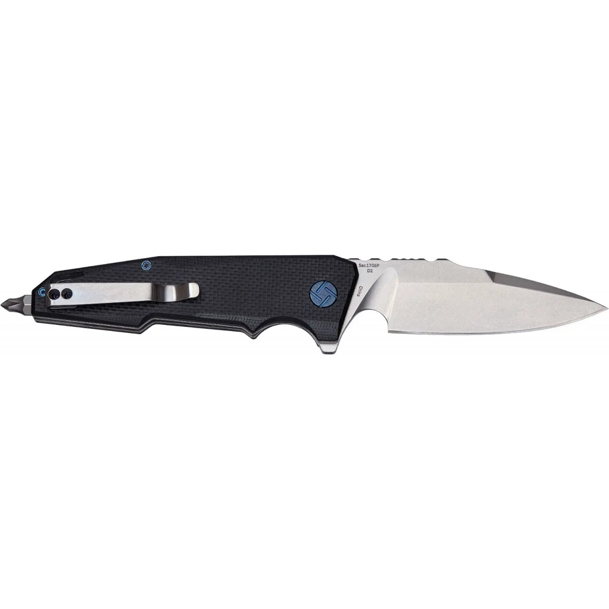 Клинок виготовлений з високоміцної сталі D2, а форма клинка drop point має підвищені колючі характеристики і є універсальним у застосуванні. Наявність фліппера дозволяє витягувати клинок швидко.