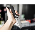 Клинок виготовлений з інструментальної сталі D2 з обробкою Stonewash, що маскує сліди експлуатації. Завдяки системі шарикопідшипників відкриття масивного клинка відбувається плавно, а надійний замок Liner Lock забезпечує фіксацію у відкритому положенні. На обуху розташовані насічки, які продовжуються на руків’ї та забезпечують більш надійний хват під час роботи.