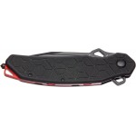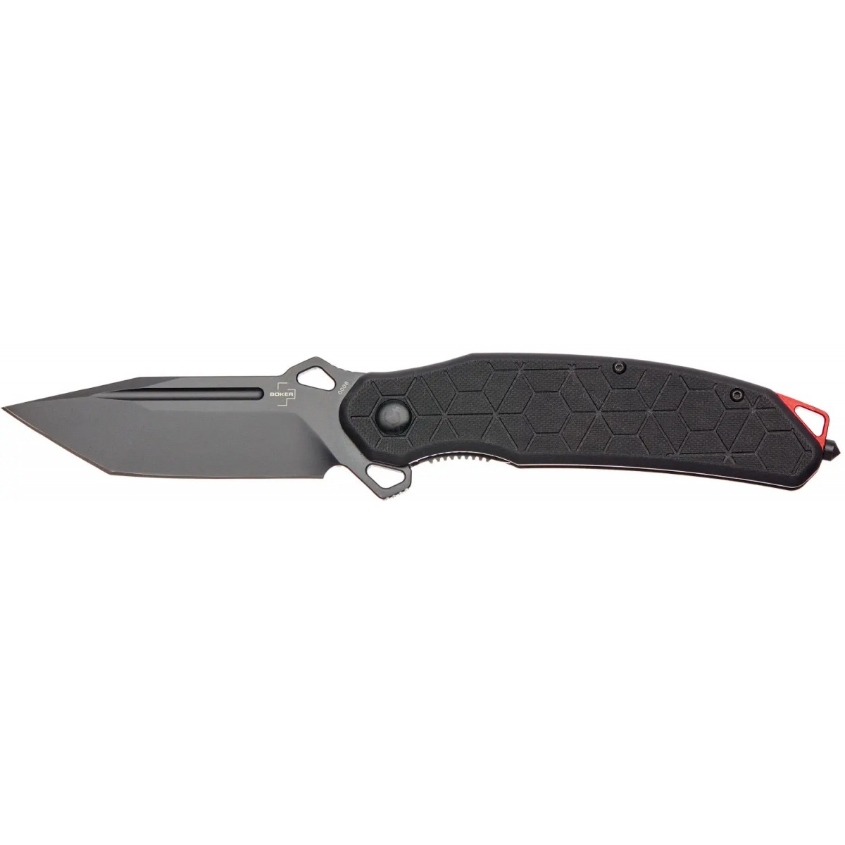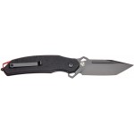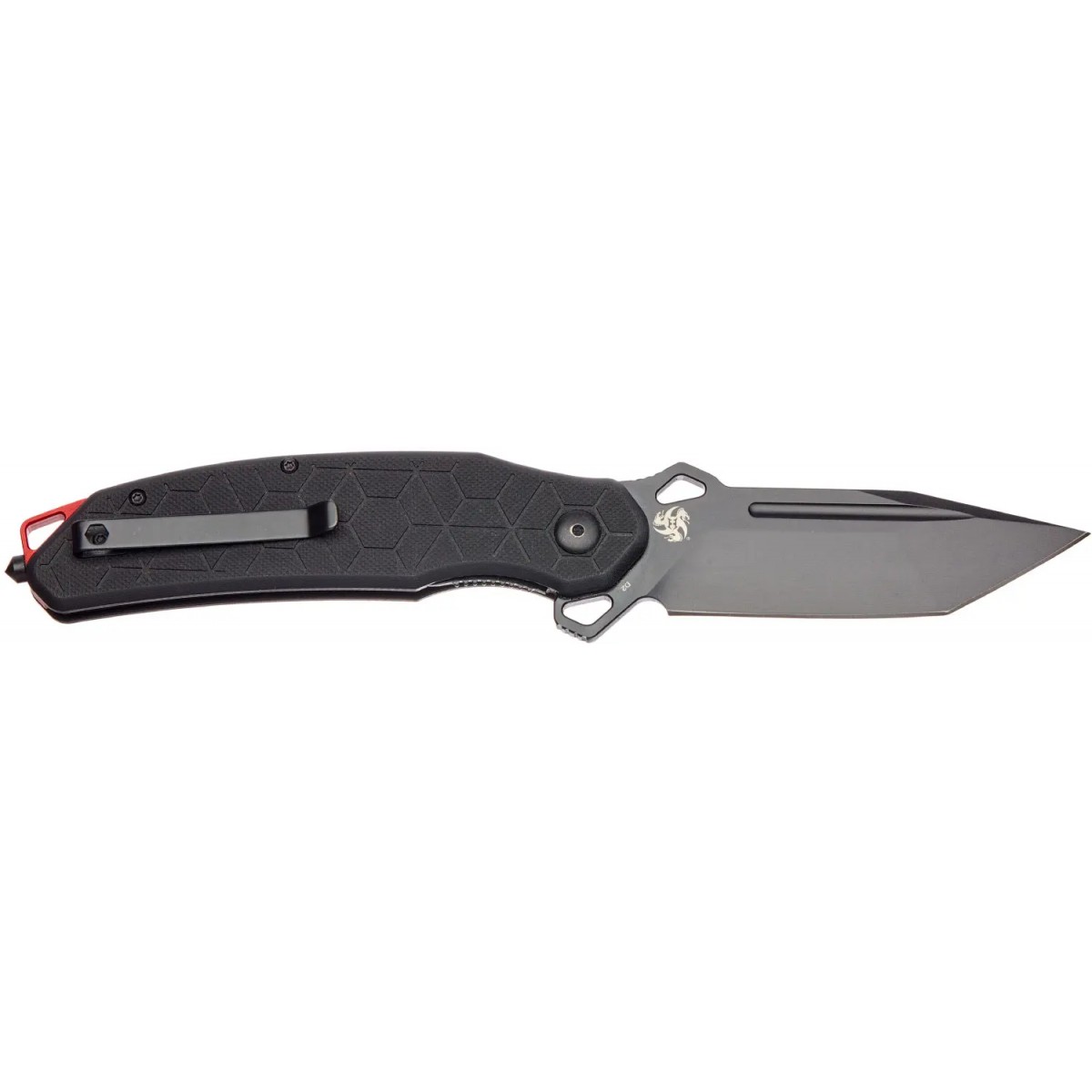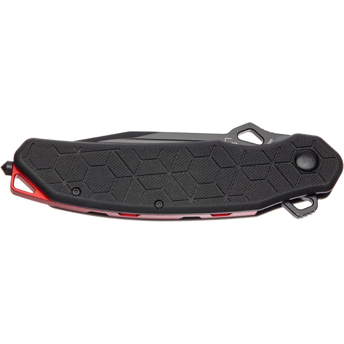 Ергономічне руків’я має текстуровані накладки, які виконані зі склотекстоліту G-10 чорного кольору і виглядають дуже стильно. Червоний лайнер завершує весь дизайн ножа. Крім того, передбачено отвір для кріплення темляка. Для комфортного щоденного носіння модель оснащена сталевою кліпсою із шестигранником.