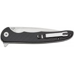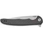 Лінії клинка плавно переходять в ергономічну рукоять з накладками з вуглецевого волокна. Це дозволяє уникнути зісковзування ножа під час роботи навіть мокрими руками. Спеціальна підпальцева виїмка забезпечує більш впевнений хват. Клинок приводиться в робоче положення за допомогою фліпера і фіксується замком Liner Lock.