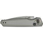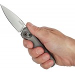 Ергономічне руків’я виконане з анодованого алюмінію. Підпальцева виїмка та титанове опорне кільце з керамічним напиленням розбавляють мінімалістичний вигляд та додають елегантності. Двостороння кліпса ще більше полегшує носіння цього і так легкого ножа в кишені.
