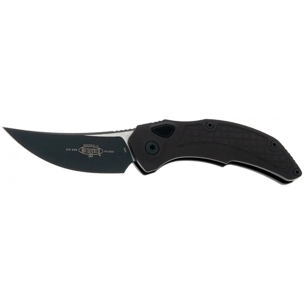 Ніж Microtech Brachial створений спільно з компанією Bastinelli Knives і є унікальною за стилем моделлю в сім'ї Microtech. Творці ножа продумали все до дрібниць, починаючи від зовнішнього вигляду і закінчуючи ергономікою. Для виготовлення Microtech Brachial використовувалися найкращі матеріали, завдяки чому він служитиме довгі роки. Клинок профілю Trailing Point виготовлений з преміальної сталі. Приводиться в робоче положення і фіксується за допомогою надійного замка Button Lock. Ергономічне руків'я, виготовлене з алюмінію, зручно лягає в руці. На торці розміщена кишенькова кліпса в положенні Tip-Up.