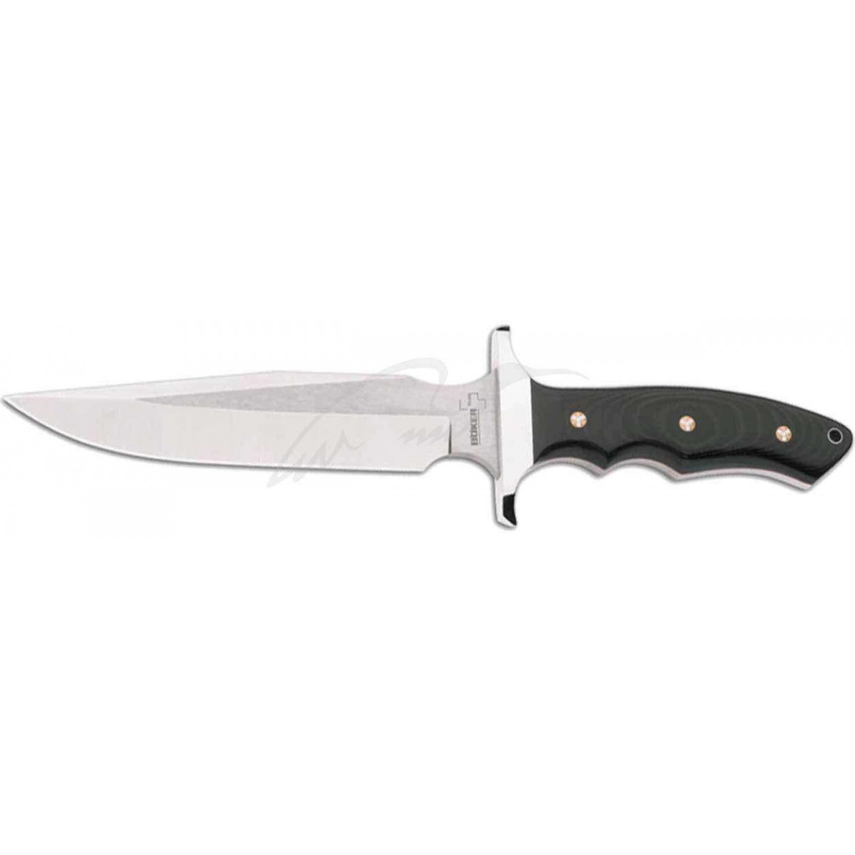 Сучасна інтерпретація класичного бойового ножа «боуї» часів в'єтнамської війни. Обробка клинка сатинуванням у двох різних напрямках створює особливу гру світла на сталевий поверхні. Клинок виготовлений з нержавіючої сталі 440С і має вражаючу товщину 6 мм Потужна сталева гарда забезпечує високу безпеку для користувача навіть в самих важких польових умовах. Рукоять з чорної микарты з глибокими подпальцевыми виїмками забезпечує виключно надійне утримання ножа в руках. Накладки рукояті кріплять до хвостовика клинка з допомогою особливих заклепок з мозаїчним малюнком – всі ці деталі надають ножу дорогий вид. Цей потужний ніж чудово підійде для будь-яких походів або полювання в найважчих умовах. В рукояті ножа є спеціальний отвір для темляка. В комплект входять шкіряні піхви.Відгуки про Ніж Boker Plus Valkyrie