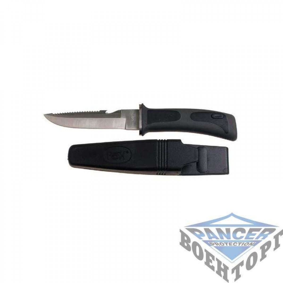 Лезо ( 11,5 см) з Sägezahnrücken & Aufreißhaken Пластикова ручка з запобіжником для піхви Оболонка виконана з пластика 2 ремені , гумові Довжина : 23 см