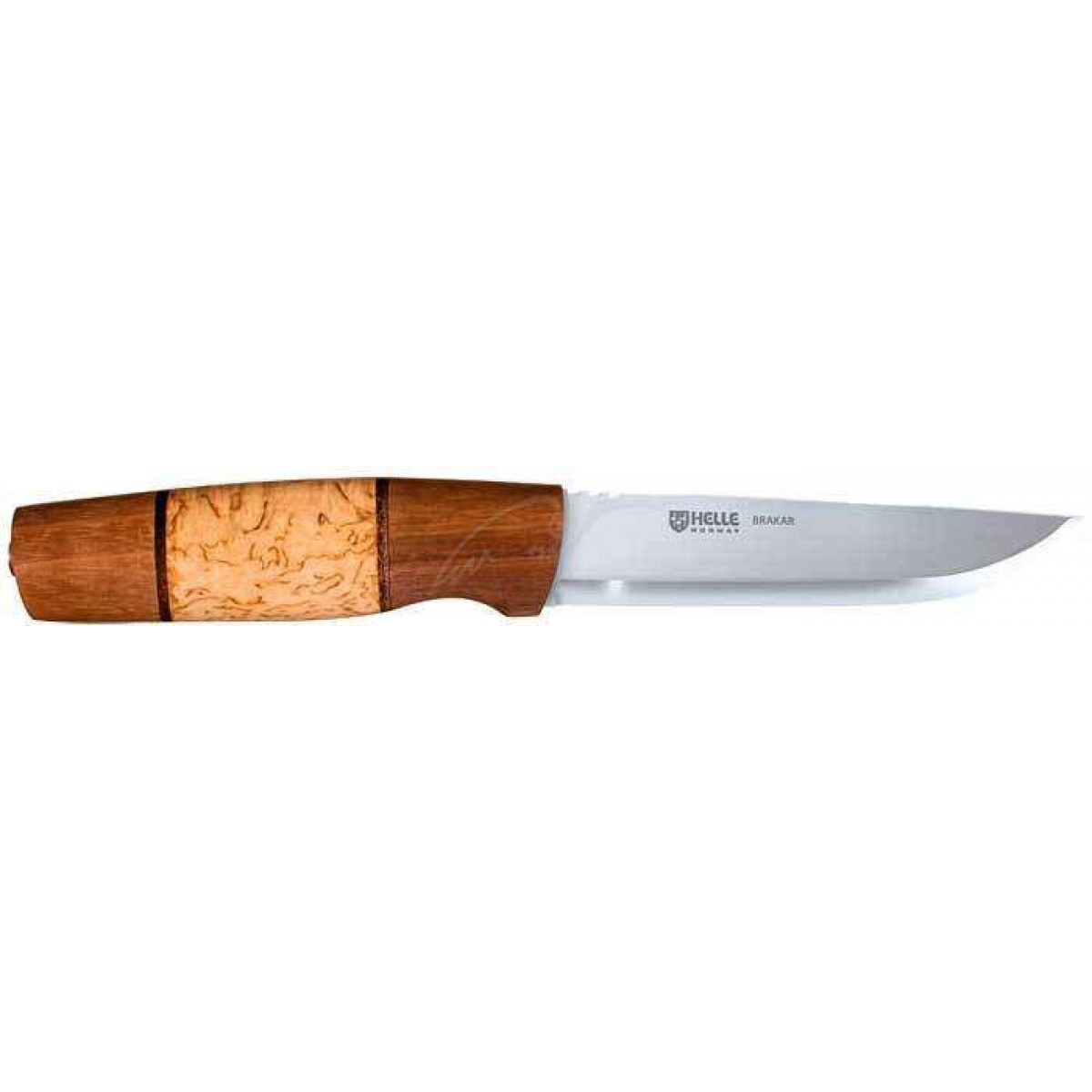 Ніж Helle BraKar є одним з самих габаритних ножів в асортименті компанії. Його клинок виготовлений з міцною та еластичною тришарової ламінованої сталі, а рукоятка поєднує в собі відразу три матеріалу – деревину горіха та берези, а також невеликі шкіряні вставки. На рукоятці передбачена невелика виїмка для запобігання зісковзування руки.