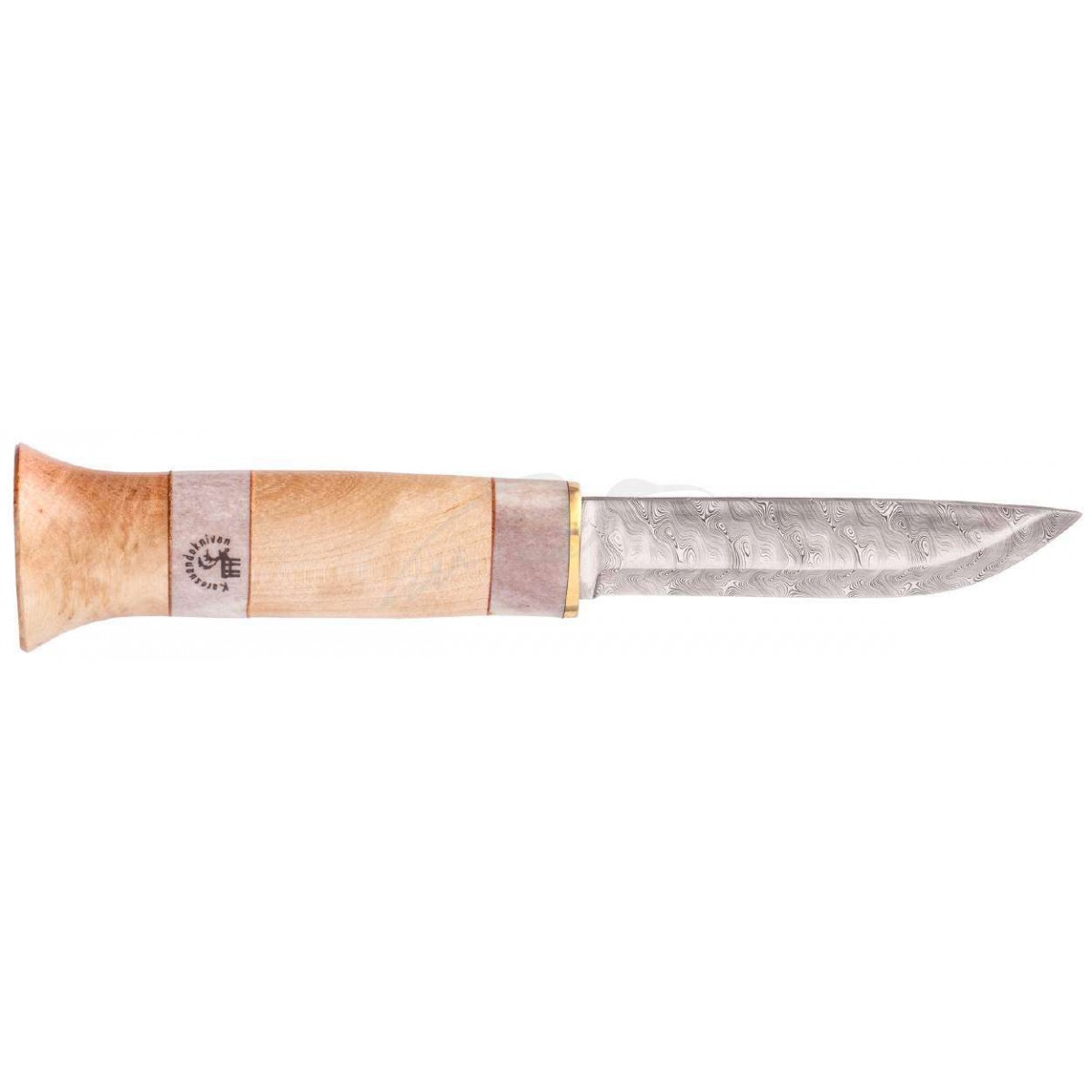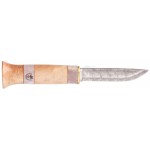 Рукоять виконана з світлою карельської берези і оленячого рогу. Клинок виготовлений з нержавіючої сталі Sandvik 12C27/ дамаської сталі, загартованої до твердості 57HRC. Ріжучу кромку формують прямі «скандинавські» спуски, які з легкістю вирішують проблему утримання кута при заточуванні.