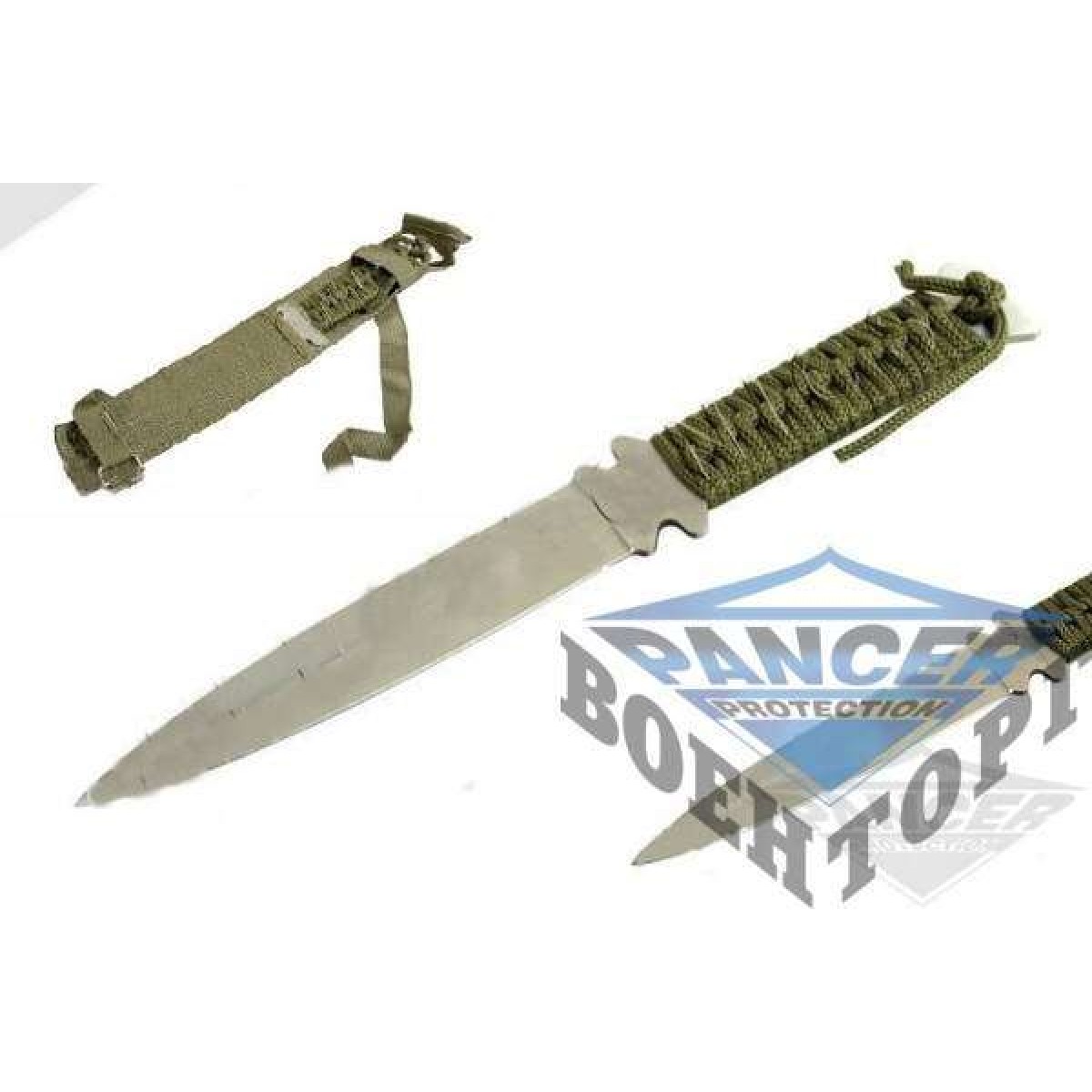 Метальний ніж металевий, виконаний з високоякісного металу, має оригінальне дизайнерське рішення – рукоятка і входить в комплект чохол з ремінцем для кріплення мають колір хакі. Загальна довжина ножа становить 25,5 см, леза – 13,5 див. Ніж може стати відмінним подарунком, так і зайняти почесне місце в колекції холодної зброї. Зберігати в недоступному для дітей та тварин місці.