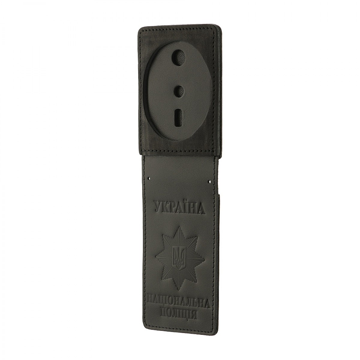Обкладинка на посвідчення та жетон поліції. Вона має вигляд книжечки. Попереду обкладинка на посвідчення має вибиті напис «Україна» (вгорі), емблему поліції (в центрі) та напис «Національна поліція» (внизу).