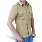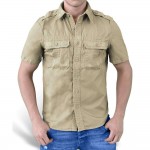 Вінтажна однотонна сорочка від світового бренду аутдор і кажуал одягу Surplus, виконана в ретро стилі. Колір сорочки бежевий, ближче до кавового. Сорочка виконана з короткими рукавами. Нагрудні кишені з клапаном на гудзиках. Матеріал комфортний, натуральний і дихаючий, що робить цю модель привабливою для походів, хайкінга або повсякденного використання. Німецький бренд Surplus - німецька якість.Brand: Surplus