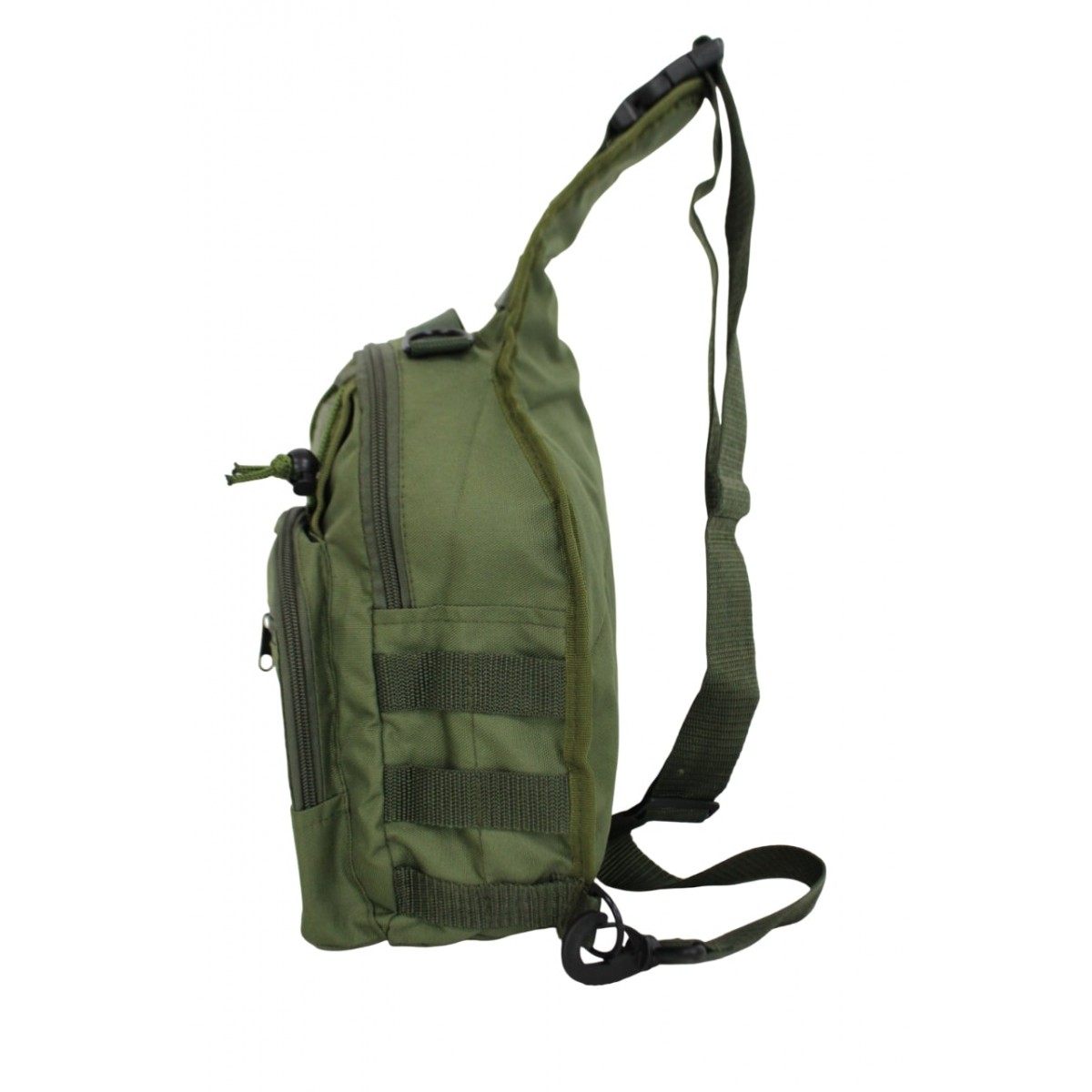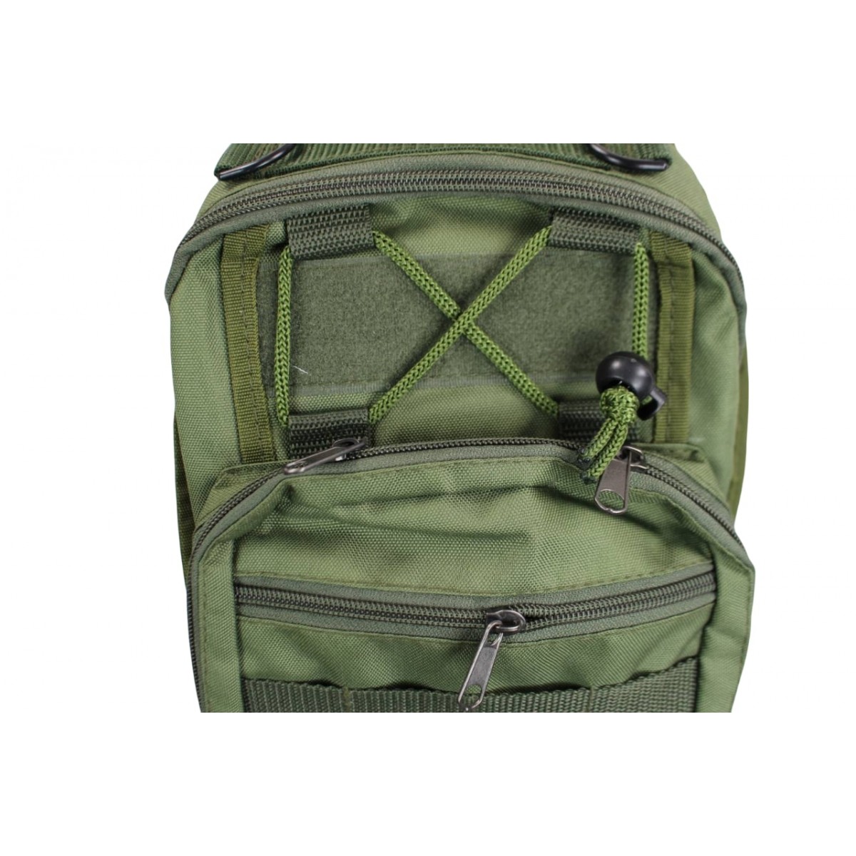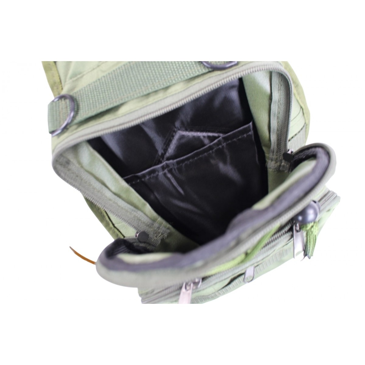 Основне відділення має глибину 9,5 см (±1 см), чого достатньо для EDC-набору, аптечки, блокнота, рукавичок чи компактного інструменту. Регульований плечовий ремінь дозволяє налаштувати посадку під будь-які умови — від щільної фіксації до вільного носіння через плече. Липучка Velcro спереду (11×5,5 см) призначена для патчів або персоналізації спорядження.