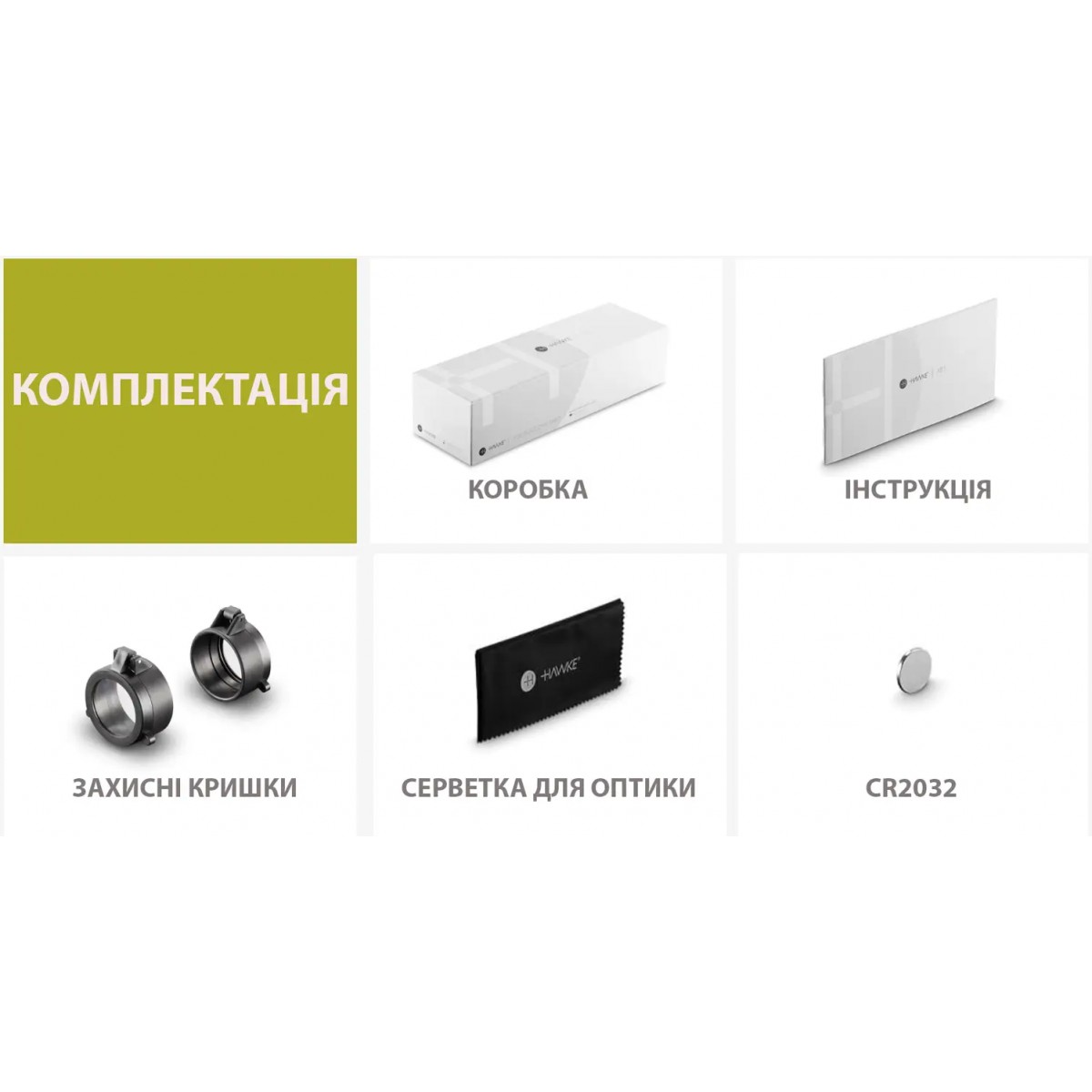 Комплектація: оптичний приціл, відкидні кришки для об’єктива й окуляра, очищувальна серветка для лінз, літієва батарея CR 2032 та інструкція із застосування.