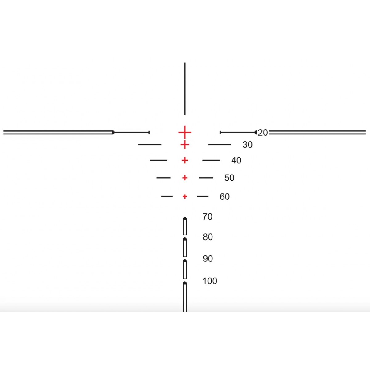 Прицільна сітка XB1 SR IR - балістична, нанесена безпосередньо на лінзу шляхом лазерного гравіювання - 100-відсоткова гарантія стійкості та відсутності зрушень під час механічних, фізичних впливів. Розміщення в другій фокальній площині забезпечує збереження товщини ліній за будь-якого збільшення, що чудово підходить для стрільби на ближні дистанції. Є підсвічування червоним і зеленим кольором з 5 регульованими рівнями яскравості на кожен з них. Основна шкала розрахована для стрільби на дистанції від 20 до 60 ярдів (18 до 54 метрів), позначена хрестиками, додаткова у вигляді зарубок - для дистанції від 70 до 100 ярдів.