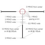 Tactical IR Dot - це нова тактична сітка, що дозволяє вести швидкісну прицільну стрільбу на коротких і середніх дистанціях. Відстань між бічними лініями сітки становить 10 MRAD, що зручно для попереднього швидкого прицілювання. Центральний підсвічується коло має діаметр рівний 5 MRAD для більш точного прицілювання, особливо в умовах зниженої видимості. Додаткові перехрестя зручні для стрілянини на середні дистанції. Всі розміри даної сітки вірні при максимальному 4-кратному збільшенні.