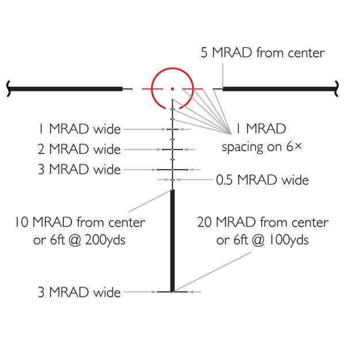 Tactical IR Dot - це нова тактична сітка, що дозволяє вести швидкісну прицільну стрільбу на коротких і середніх дистанціях. Відстань між бічними лініями сітки становить 10 MRAD, що зручно для попереднього швидкого прицілювання. Центральний підсвічується коло має діаметр рівний 5 MRAD для більш точного прицілювання, особливо в умовах зниженої видимості. Додаткові перехрестя зручні для стрілянини на середні дистанції. Всі розміри даної сітки вірні при максимальному 6-кратному збільшенні.