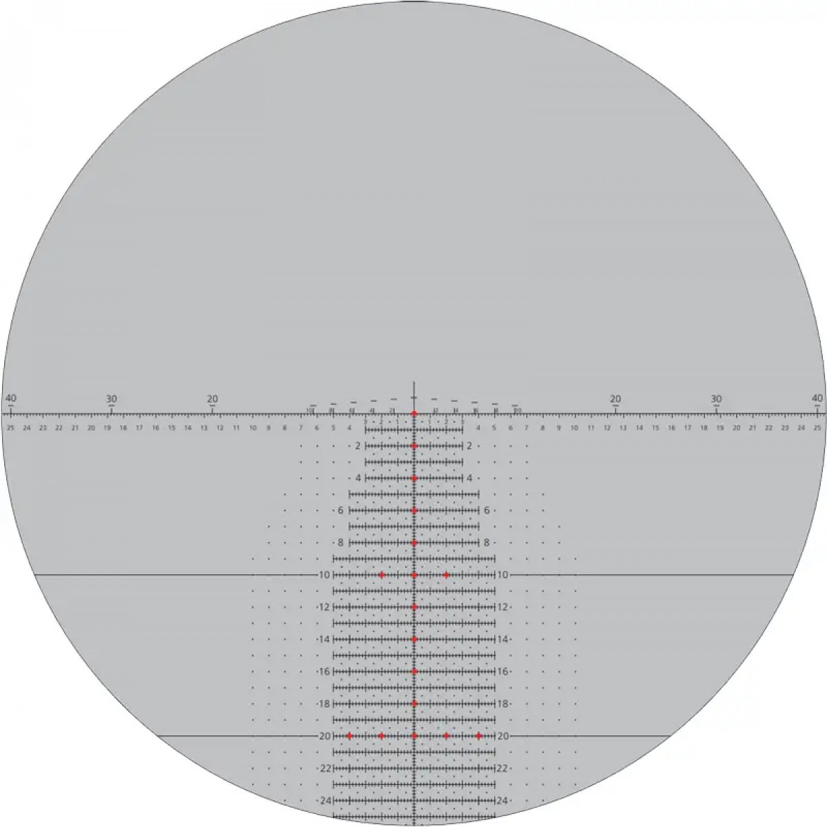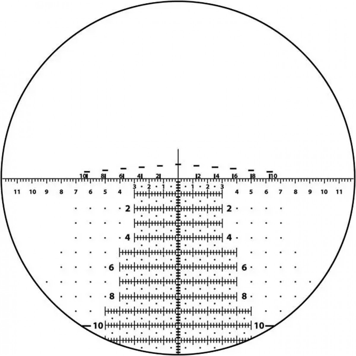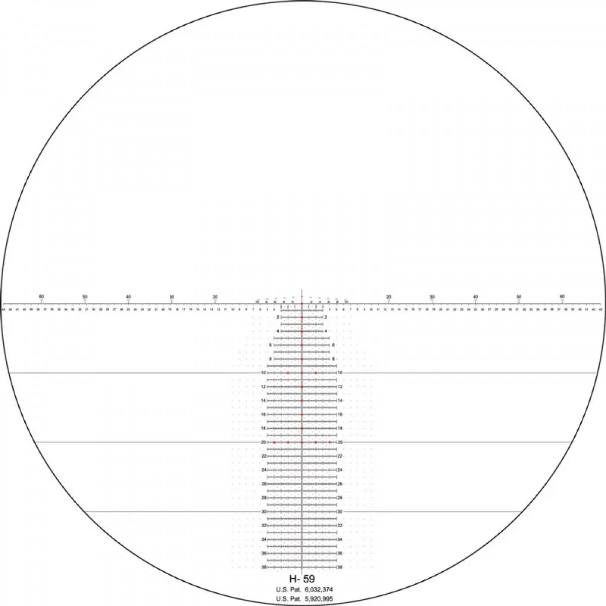- Прицільна сітка H59 розташована в першій фокальній площині. Сітка Horus H59 дає змогу робити миттєве коригування на точку влучання і забезпечує швидкий перехід від цілі до цілі без необхідності вручну вводити поправки. Для швидкісної стрільби на дистанції до 600 метрів використовується запатентована схема Horus Rapid Range Bars.