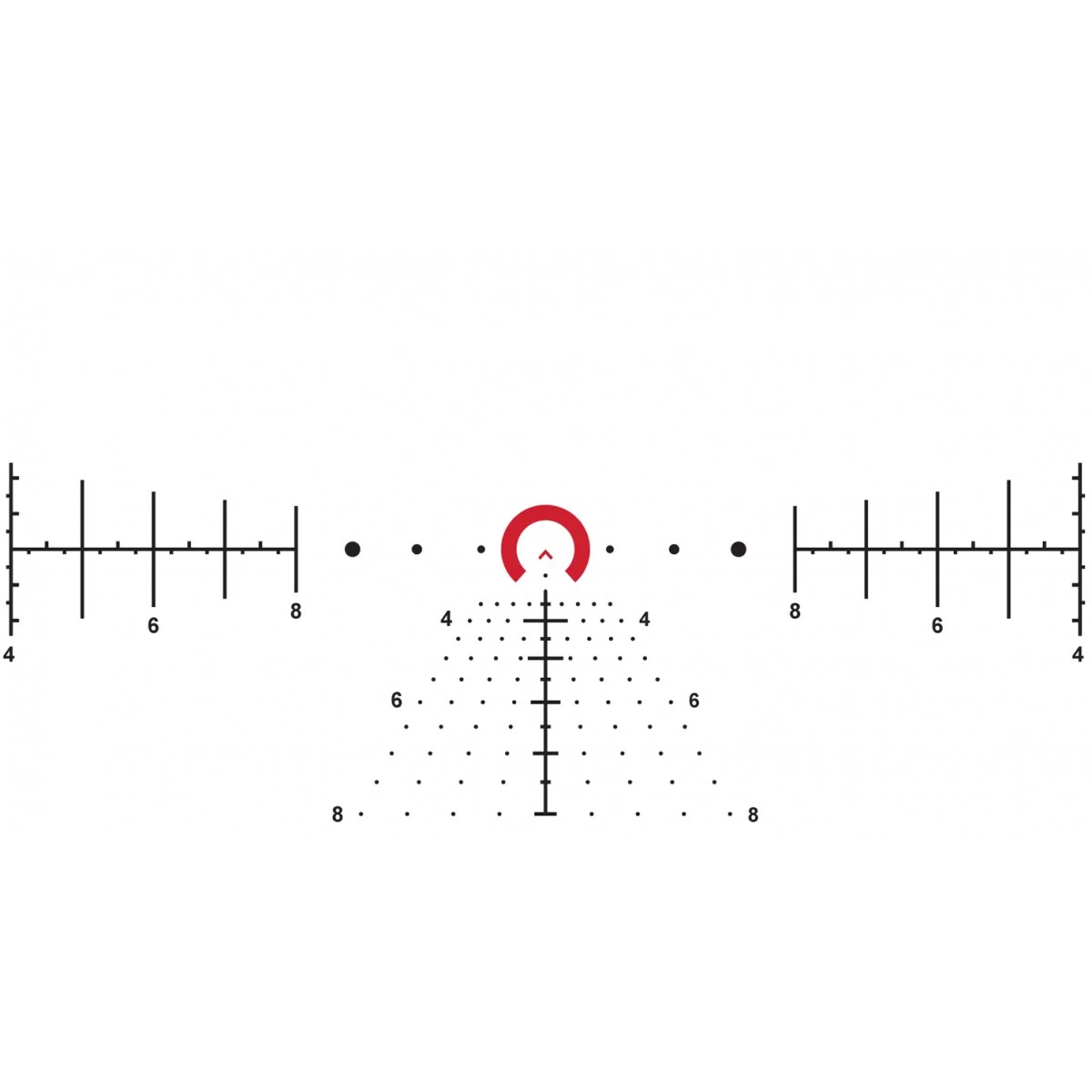 ACSS Raptor M10S спеціально розроблена для прицілів з діапазоном збільшення 1–10х, поєднує швидкість наведення на ближніх дистанціях та високу точність на дальніх. При невеликому збільшенні вона забезпечує швидке прицілювання завдяки яскравому центральному шеврону та зовнішньому кільцю‑підкові, що дозволяють миттєво зосередити погляд на цілі. Для стрільби на більші відстані сітка пропонує повний функціонал балістичної системи ACSS: вертикальні та горизонтальні шкали для визначення дистанції, мітки для поправок на вітер різної сили, позначки випередження для стрільби по рухомих цілях, а також балістичні шкали для компенсації падіння кулі на дистанціях до 800 ярдів.