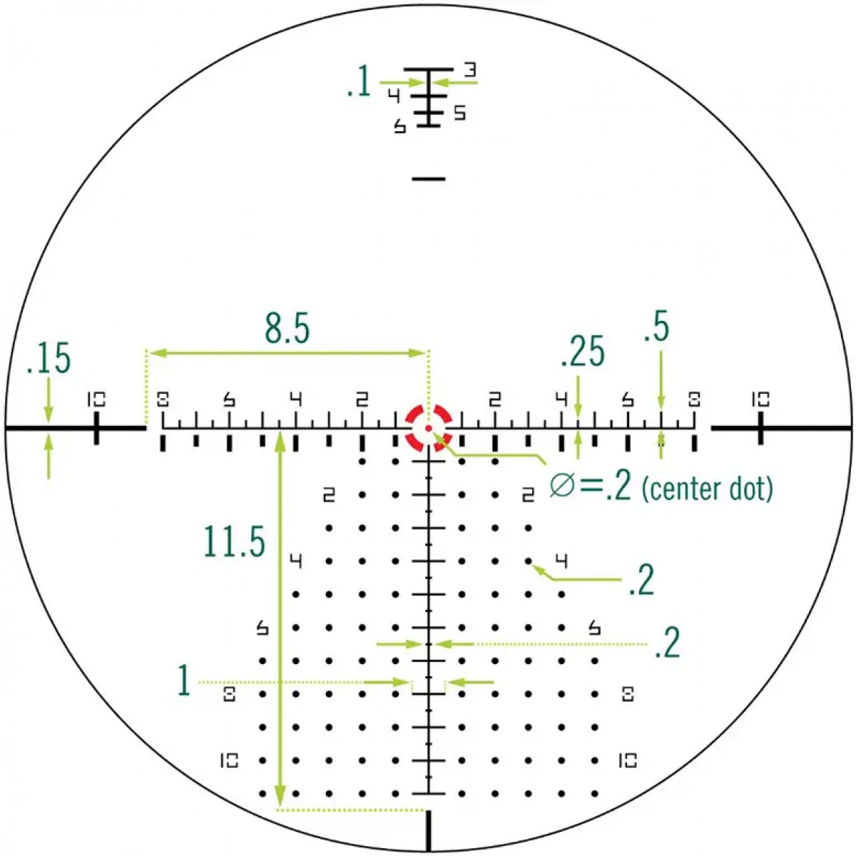 • Закриті низкопрофильні барабани введення поправок дозволяють змінювати налаштування навіть в тактичних рукавичках. Клік барабана переміщує сітку 0,1 MIL, повний діапазон регулювання сітки становить 30 MIL по вертикалі і горизонталі.