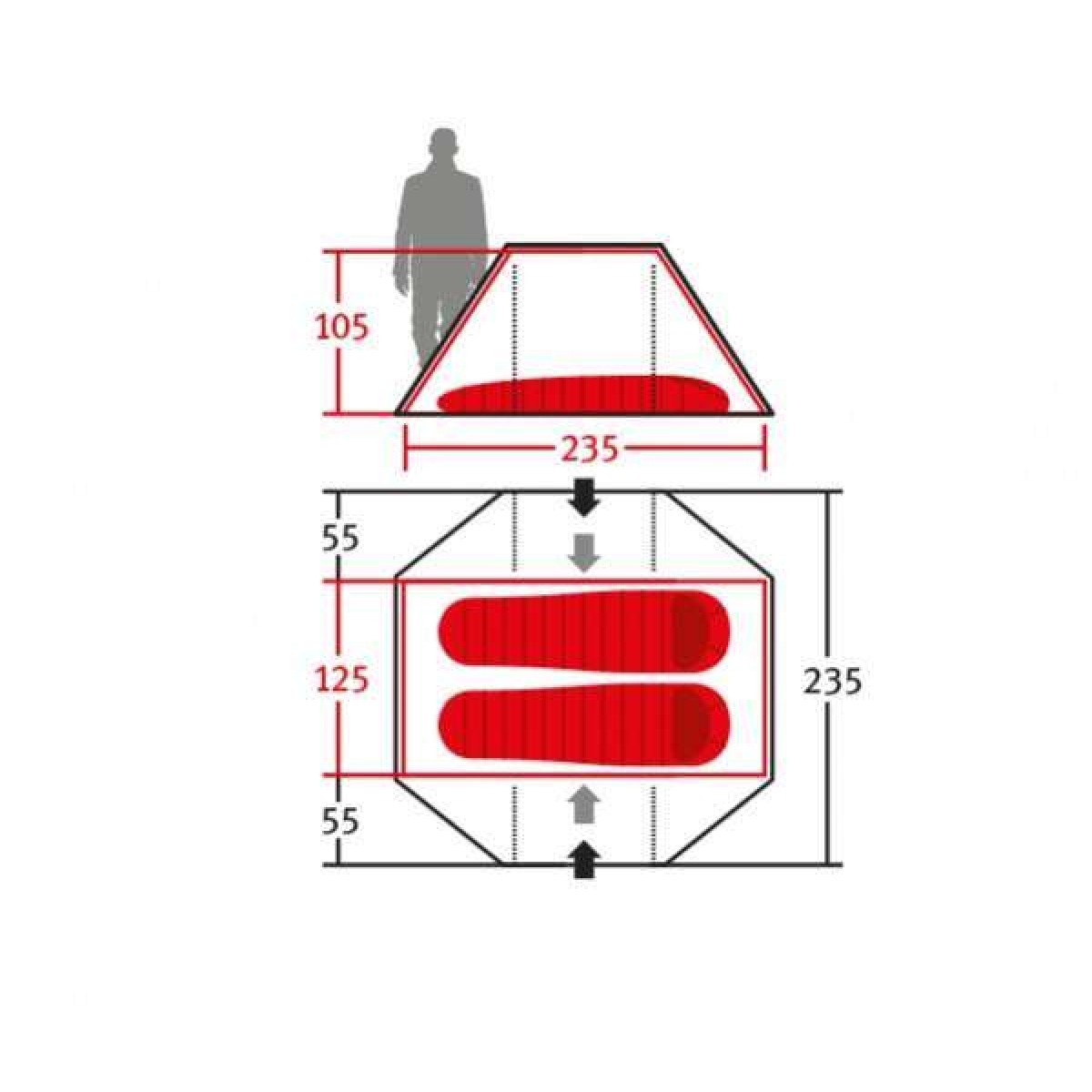Матеріал покриття: Nylon Rip Stop 40D 240T, двостороння силіконове просочення, 2000 мм в. ст., вага - 53г/м, міцність на розрив - 11кг. Міцна, надлегка тканина, що застосовується при виробництві зовнішніх тентів для використання в екстремальних умовах. Володіє підвищеною міцністю на розрив завдяки вплетению більш міцної нитки за спеціальною технологією Rip Stop. Надійна двостороння силіконове просочення запобігає проникненню вологи.