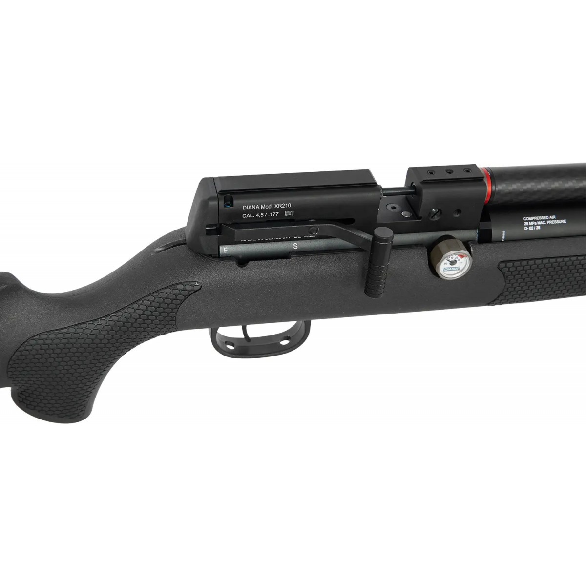 Також Diana XR210 регулюється за допомогою регулятора Altaros, який призначений для постійного підрахунку кількості пострілів. На правій стороні механізму встановлений манометр, який показує налаштування редуктора. Крім того, рівень потужності можна регулювати за допомогою гвинта.
