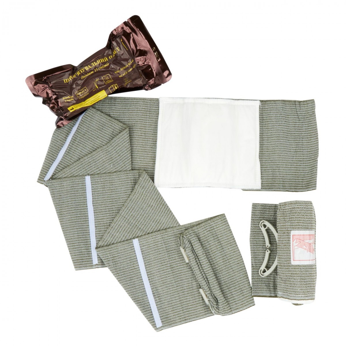 Призначений для надання медичної допомоги при пораненнях, для перев’язування ран і для забезпечення ефективного тиску на джерело кровотечі. Складається з еластичного бинта розміром 15 см*1,5 м, прошивається подушкою розміром 14*16 см, яка виготовлена з абсорбувальної тканини, основне завдання якої – вбирати кров.