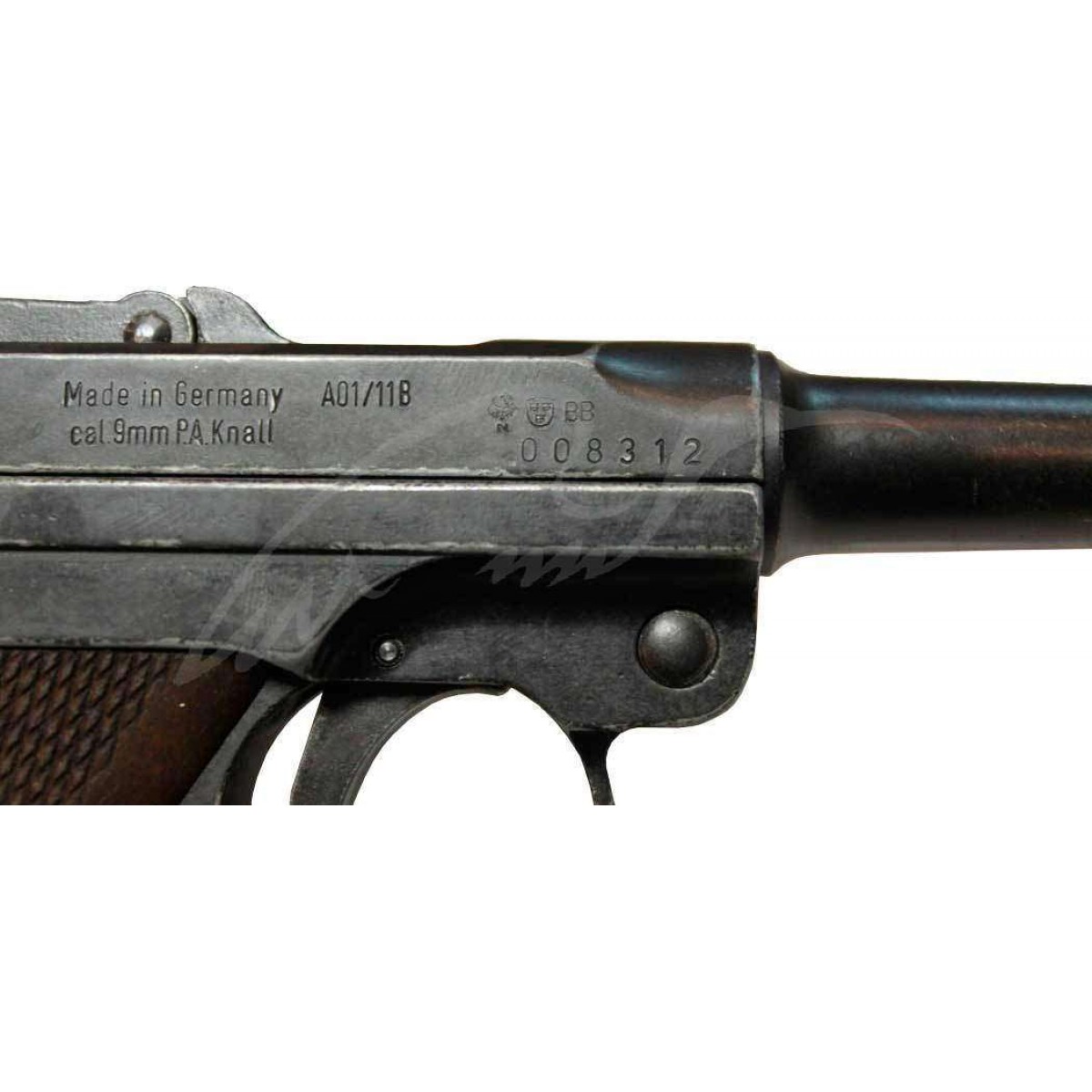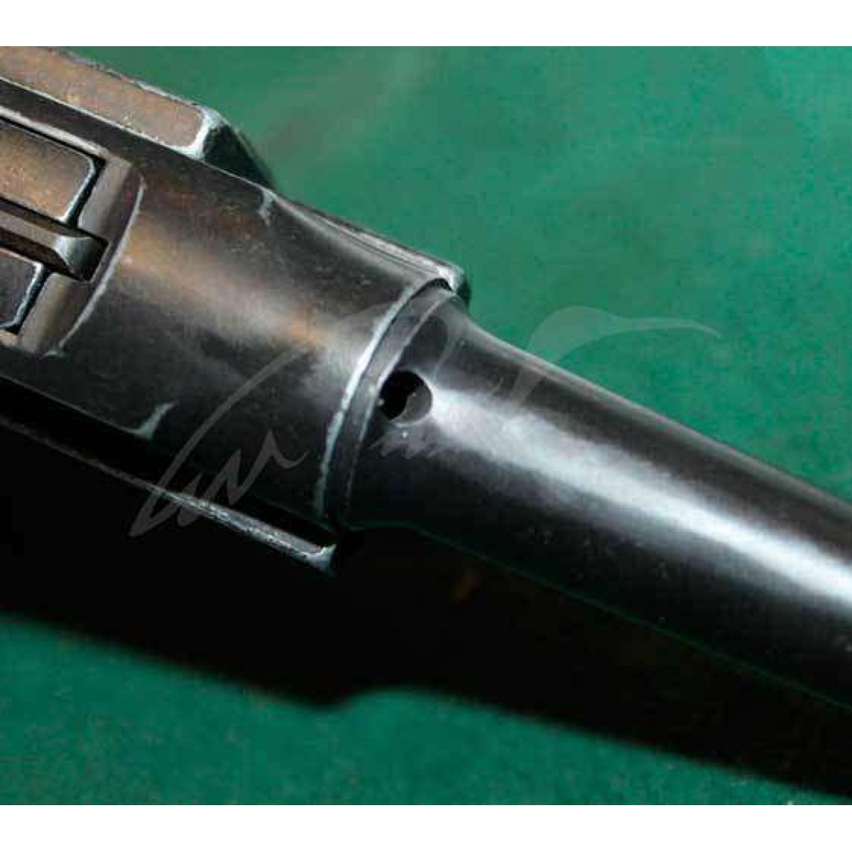 Пістолет упакований в зручний, невеликий пластиковий кейс на кліпсах. Кейс всередині оснащений м'якою поролоновою подушкою, на якій розміщений пістолет.Пістолет грамотно зістарений на заводі і має привабливий вигляд. Дерев'яні накладки на рукоять виконані дуже точно і грамотно. Стовбур заглушений намертво з двох сторін, причому настільки грамотно, що це відразу не побачиш. Для виходу порохових газів виконано спеціальний отвір у підстави стовбура, біля місця стику стовбура і ствольної коробки. Стовбур намертво посаджений у ствольну коробку і заміна його неможлива. Замикання стовбура – кривошипно-шатунное. Замикаюча система, як і в оригіналі, складається з двох важелів: шатуна і кривошипа. Запобіжник, як і в оригіналі, флажкового типу. Пістолет оснащений однорядним, коробчатим магазином на чотири 9-ти мм холостих патрона.