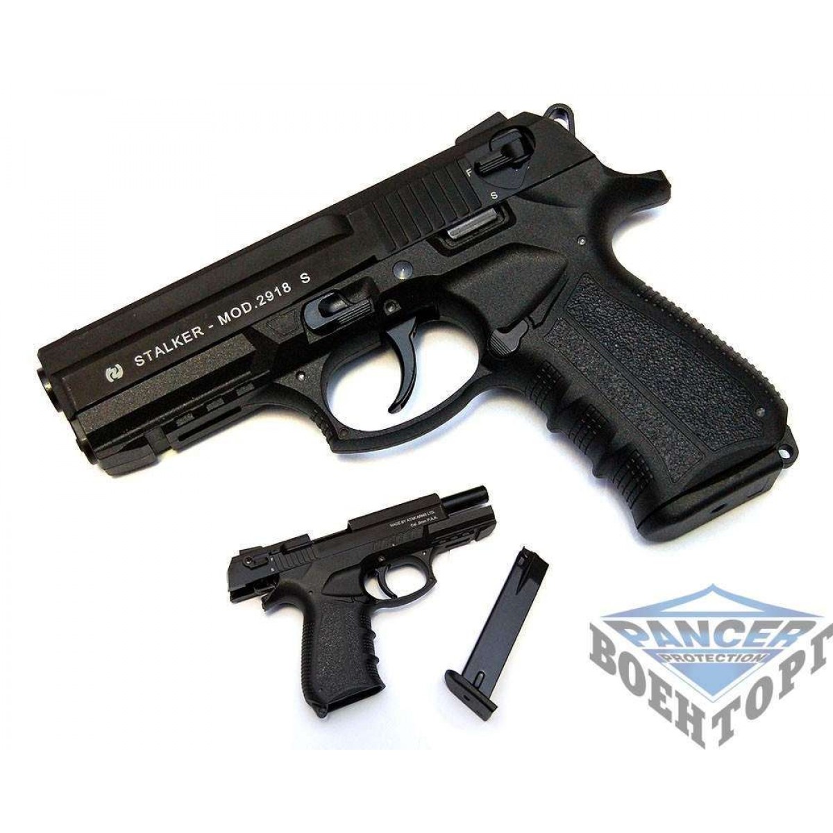 2918 виконаний з урахуванням багатого досвіду розробників, матеріалом виконання залишився все той же сплав, надійно зарекомендовавшй себе на світових ринках. У стовбурі є сталевий льойнер(магнитится) Затворна рама має якісне та приємне матове покриття, стійке до механічних пошкоджень середнього рівня. Діаметр стовбура 16мм, що дало зробити товщі стінки каналу ствола на 0,5 мм більше, ніж у попередників. Прицільні пристосування правильні, в руці сидить зручно. Люфту не виявлено, запобіжники зібрані толково, і забезпечують захист високого рівня. Тест-відстріл з 100 патронів не виявив клина, викидання гільзи четконправленный, незалежно від темпу стрільби. Спуск середній, передбачуваний, услилие спуску - близько 2кг, з попереднього взводу спуск дуже зручний. Зривів при навантаженнях, падіннях, вібрації не виявлено. Поворотна пружина середньої жорсткості. Вага пістолета розміщений уздовж прицільної лінії, що позитивно позначається на задирання ствола у момент стрілянини. Комплектація: пістолет, пластиковий кейс, йоржик для чищення, висновок фахівця з ДНДЕКЦ про не належність до вогнепальної зброї.