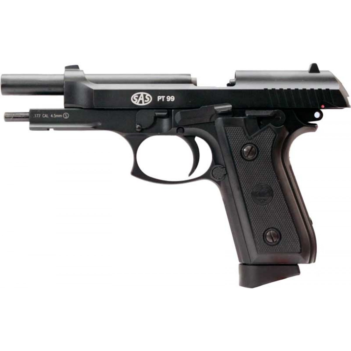 Під ствол SAS PT99 (Beretta M92) інтегрована планка Пікатіні, що дозволяє оснастити модель ліхтарем або цілевказівником.Відгуки про Пістолет пневматичний SAS (Taurus PT99) Blowback. Корпус - метал