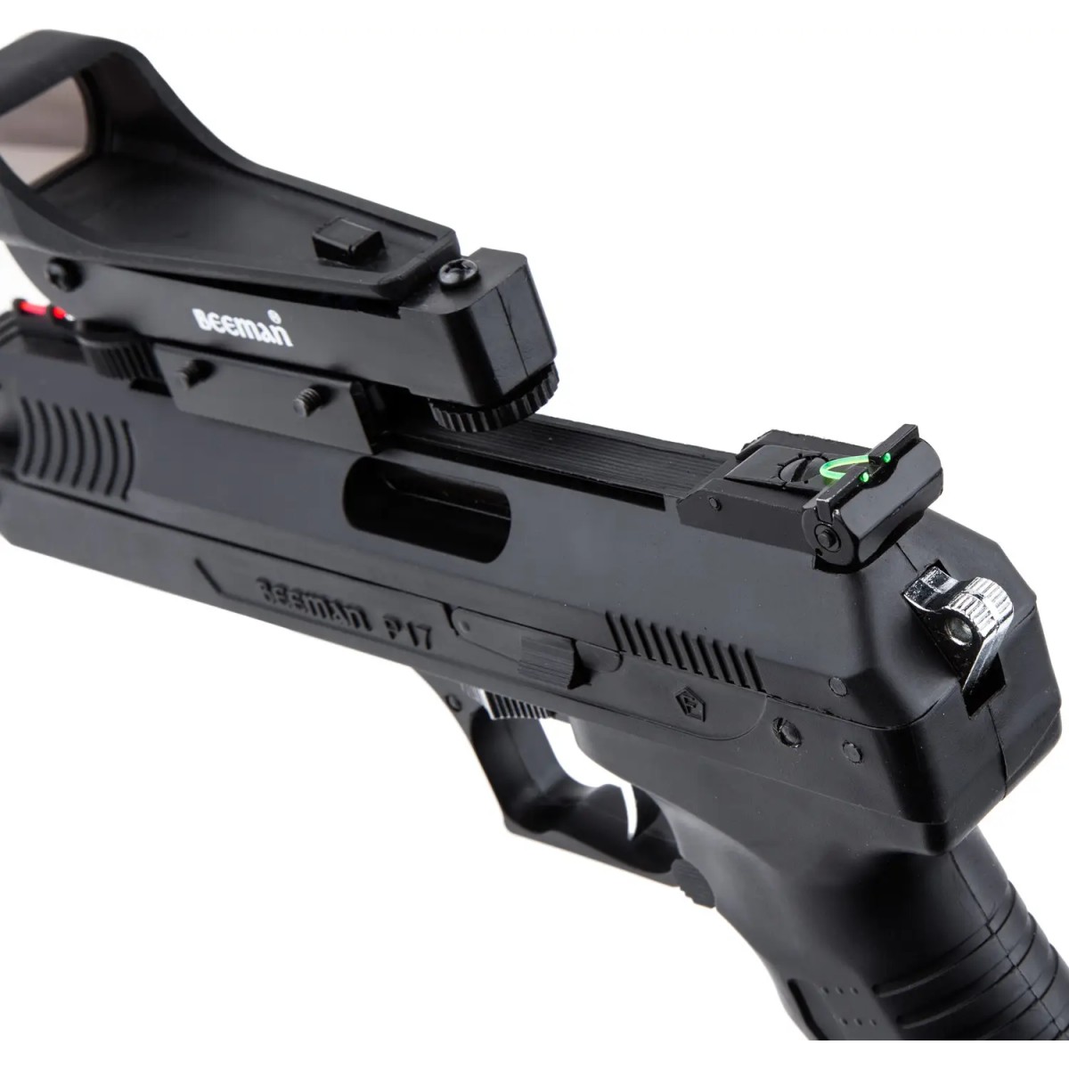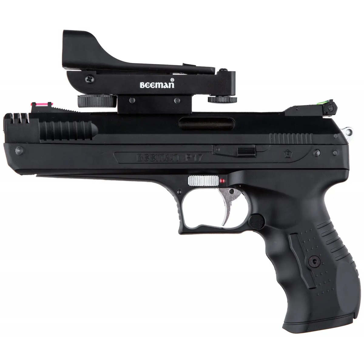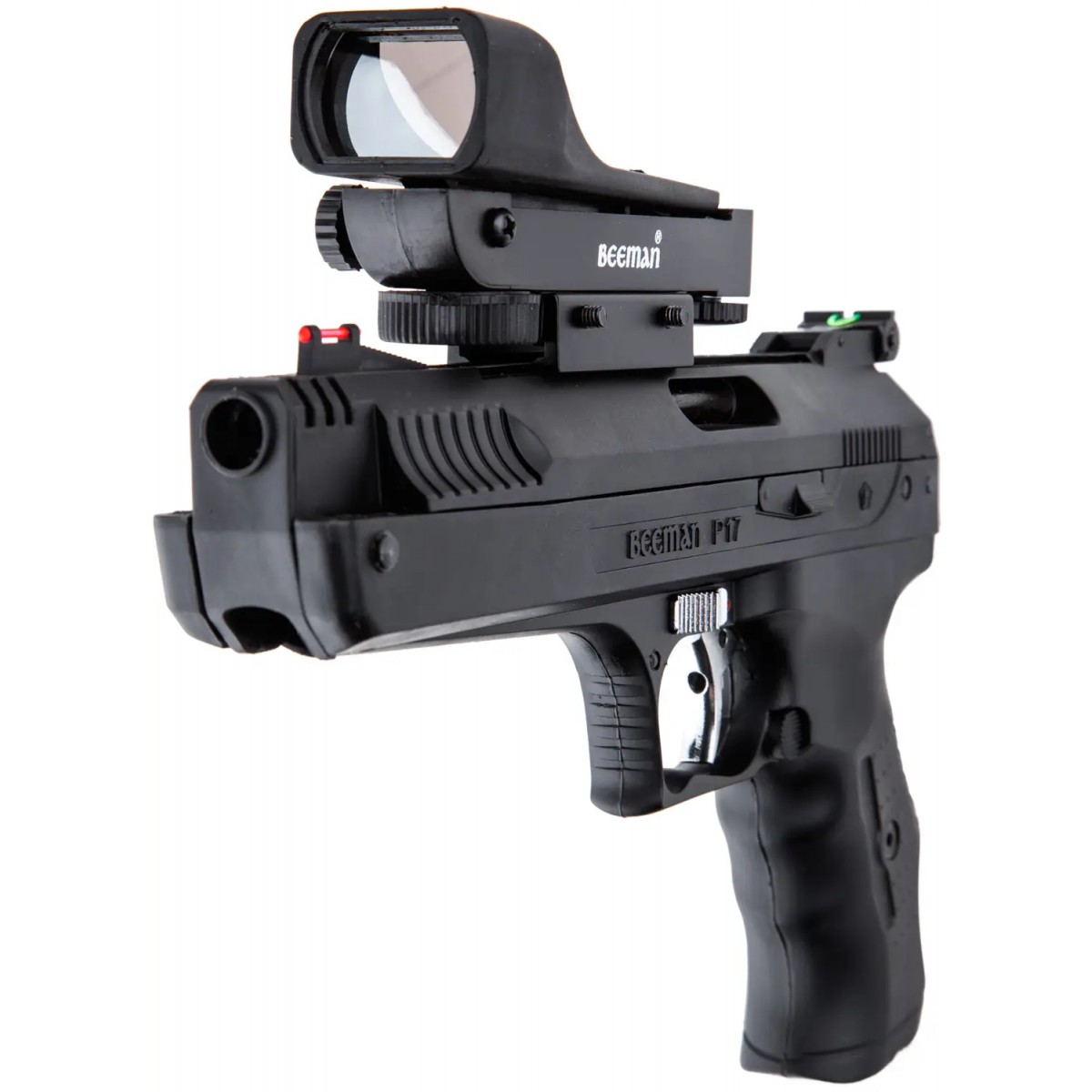 Пневматичний пістолет Beeman P17 відрізняється високою ергономічністю і чудовою точністю. Оптимально підійде як для спортивної та розважальної стрільби, так і для отримання базових навичок у поводженні з короткоствольною зброєю. Пістолет оснащений автоматичним запобіжником і регульованим по висоті й горизонталі ціликом. Для більш комфортного прицілювання пістолет оснащений коліматорним прицілом з можливістю регулювання.