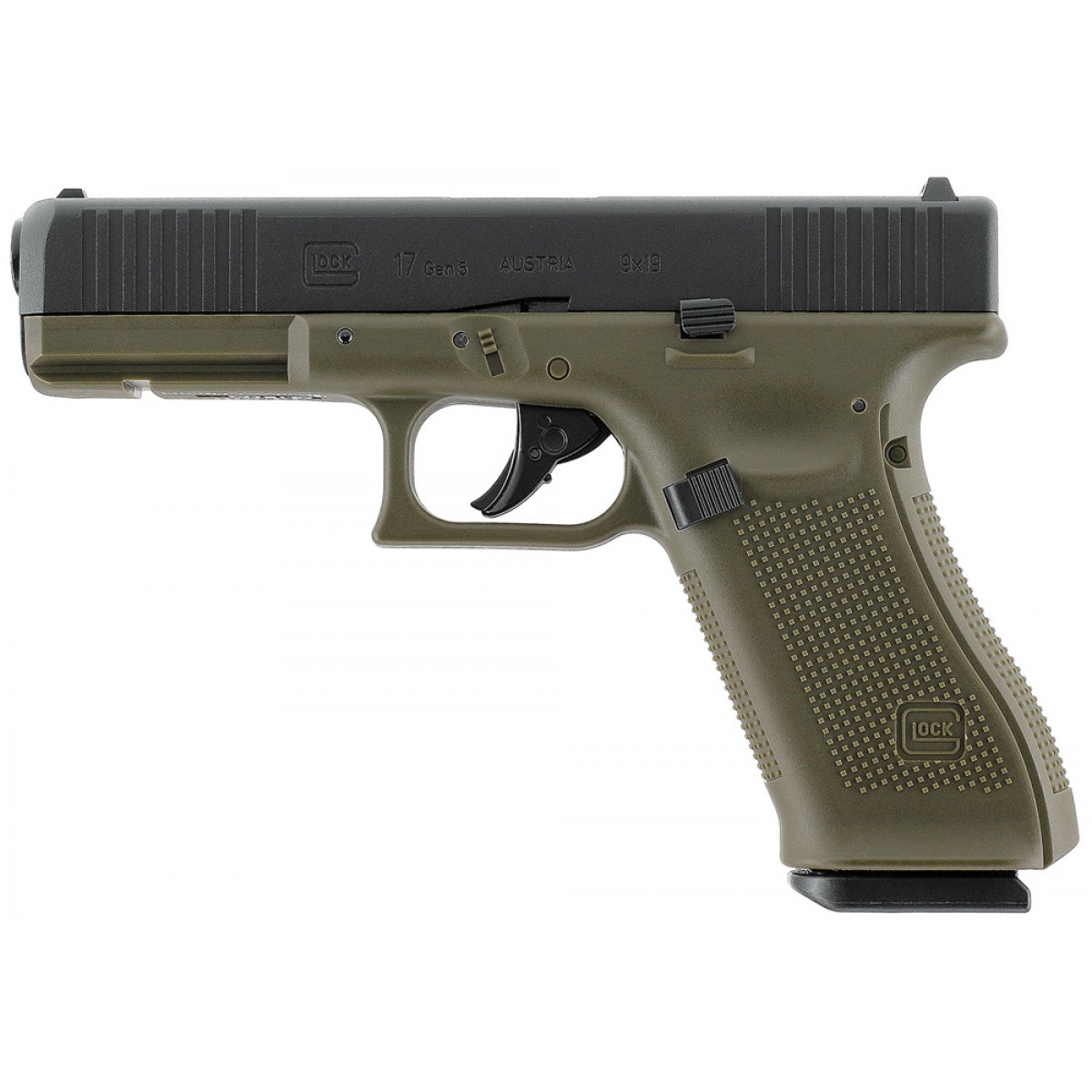 В ціій моделі пістолета Glock 17 Gen5 від Umarex рамка виконана у зеленому кольорі. Також пістолет оснащений системою імітації руху затвора та віддачі Blowback, яка надає реалістичності при стрільбі. Як боєприпас в даній версії застосовано кульки ВВ калібру 4,5 мм. Ємність магазина - 18 кульок.