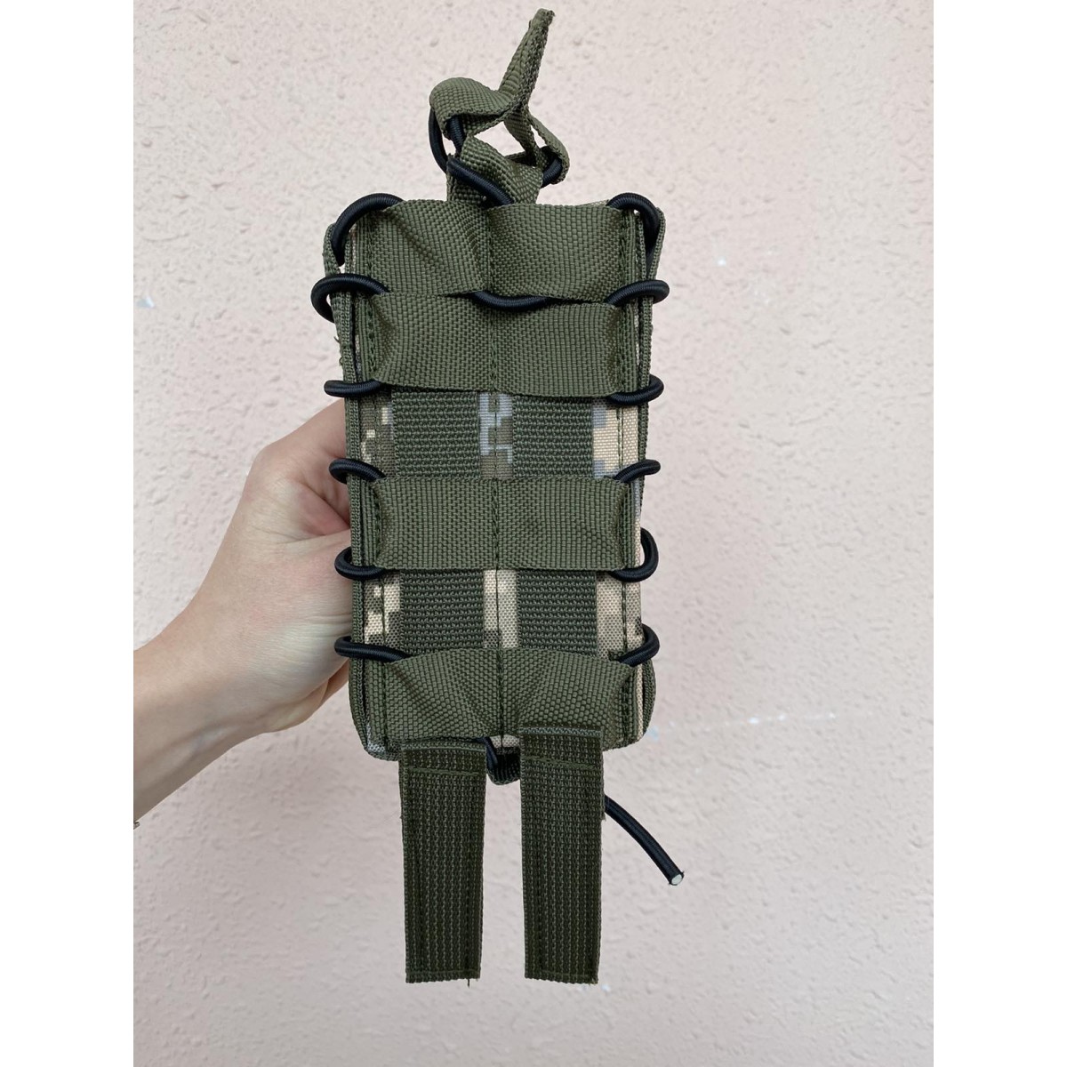 Підсумок одинарний для магазину АК виготовлений з якісних матеріалів, має стандартне кріплення MOLLE, що дозволяє використовувати підсумок з будь-якими серійними розвантаженнями, тактичними поясами та бронежилетами. Магазин зверху фіксується гумкою для швидкої перезарядки, гумка має запас довжини для різних потреб. Лицьова частина підсумка має кріплення MOLLE і дозволяє збирати один з одним кілька підсумків.