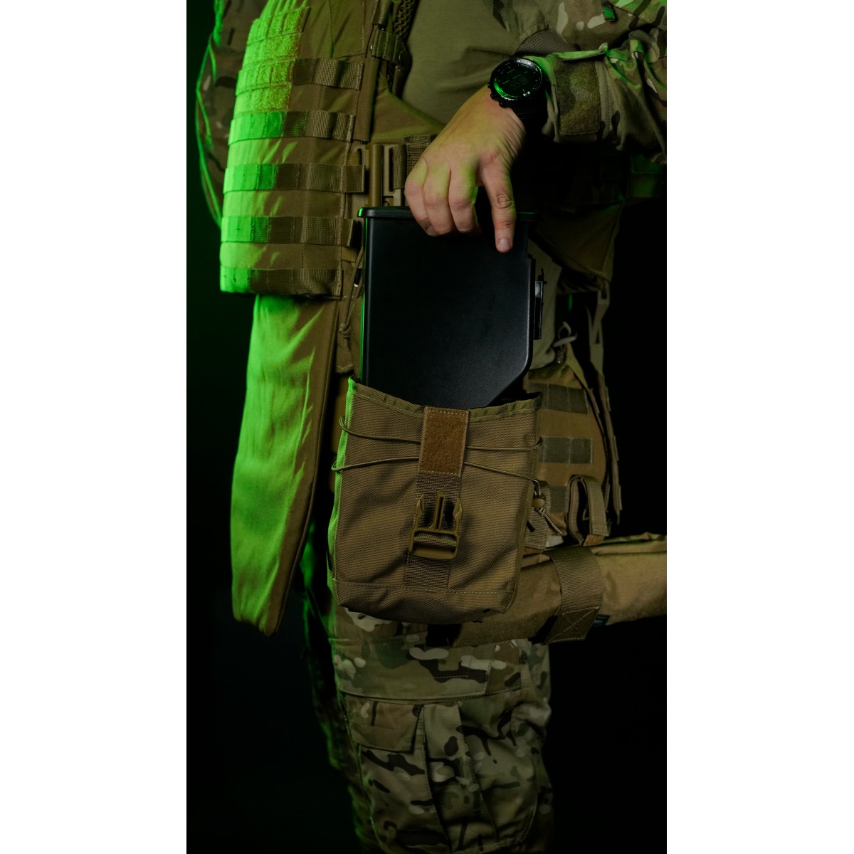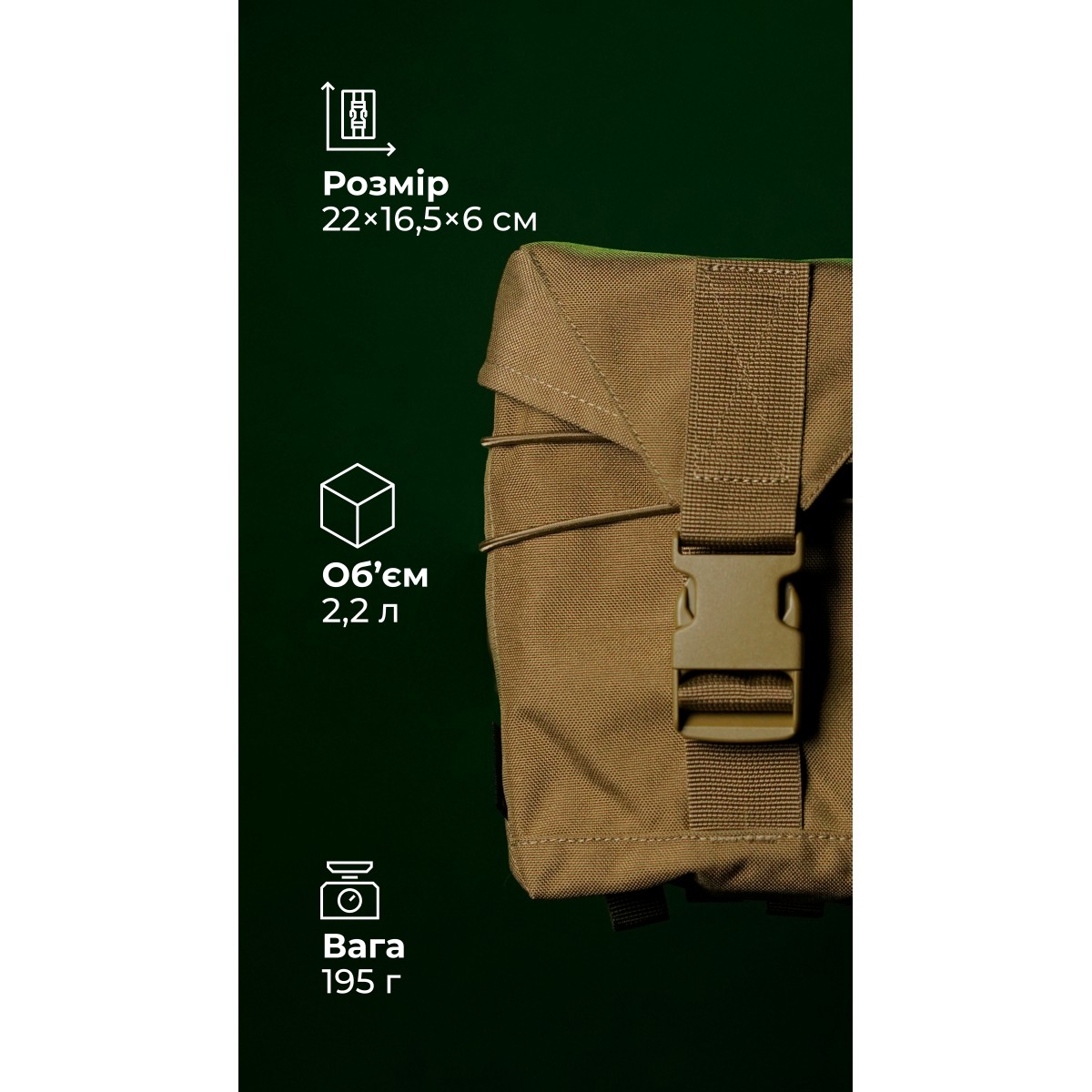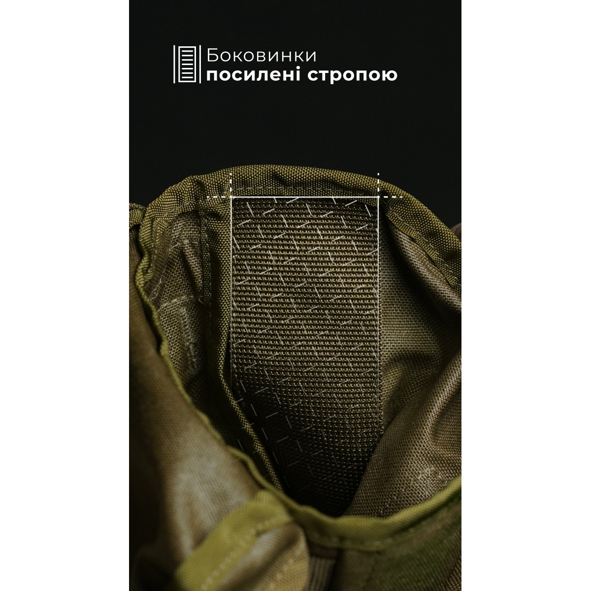 Підсумок «Стрічник» створений для перенесення короба на 200 набоїв до кулемета М249. ✅ Ключові переваги Вміщує короб на 200 набоїв калібру 5,56×45 мм Застібається на фастекс і липучку Посилені стропами боковини Прямокутна форма дає змогу швидко ставити короб будь-яким боком Може використовуватися як утилітарний підсумок Вміщує 5 магазинів AR/AK Кріпиться на моллі Стягується шоккордом для компактності Отвір з люверсом на дні для виходу вологи й сміття Витривалі матеріали – нейлон 1000D (аналог Cordura) Фурнітура WJ (Південна Корея) Опис товару Підсумок складається з єдиного відділення, яке закривається клапаном із фастексом та велкро. Липучка під клапаном закрита заглушкою на випадок, якщо ви волієте обмежитись лише фастексом. Але незалежно від того, закритий підсумок лише на липучку чи на фастекс і на липучку, він розкривається практично миттєво. Завдяки жорсткішій фіксації фастекса підсумок зручно закривати після вилучення короба навіть наосліп однією рукою – тризуб завжди перебуває у правильному положенні і його не потрібно шукати. Зсередини на боковинах нашиті стропи, які допомагають зручніше вкладати короб, підтримують форму підсумка та протистоять зношуванню. Через фасад протягнутий шоккорд для зменшення об’єму порожнього або напівзаповненого підсумка. Таким чином можна зафіксувати всередині вміст, щоб він не зміщувався і не випадав. Підсумок має прямокутну форму та не має скосів, тому короб можна розміщувати в ньому у будь-якому напрямку та носити зі зручного вам боку. Підсумок кріпиться до спорядження на систему MOLLE. Займає ширину 4 чарунок на вашому РПС чи рюкзаку. У дні вирізаний отвір із металевим люверсом, через який виходить дрібне сміття, пісок, волога. ❓ Часті запитання Чи адаптований підсумок під скошену форму короба? Ні, підсумок має прямокутну форму, без скосів. Тому не потрібно зайвий раз звіряти, чи потрібним боком ви ставите короб. Як доглядати за підсумком? Рекомендуємо прати вручну або очищувати м’якою щіткою з водою та безфосфатним порошком.Відгуки про Підсумок для короба під кулемет М249 "Стрічник" (Койот) ТМ Балістика