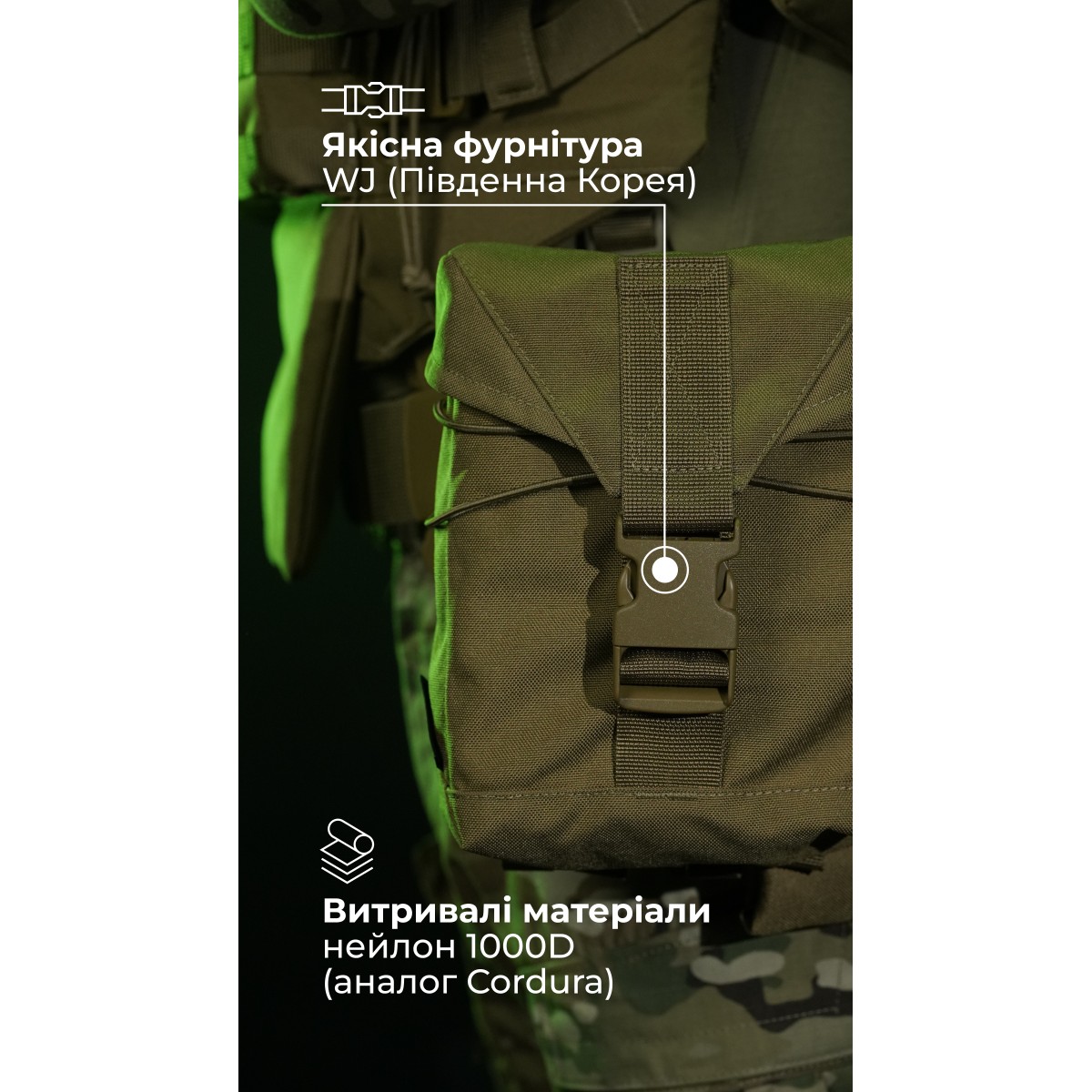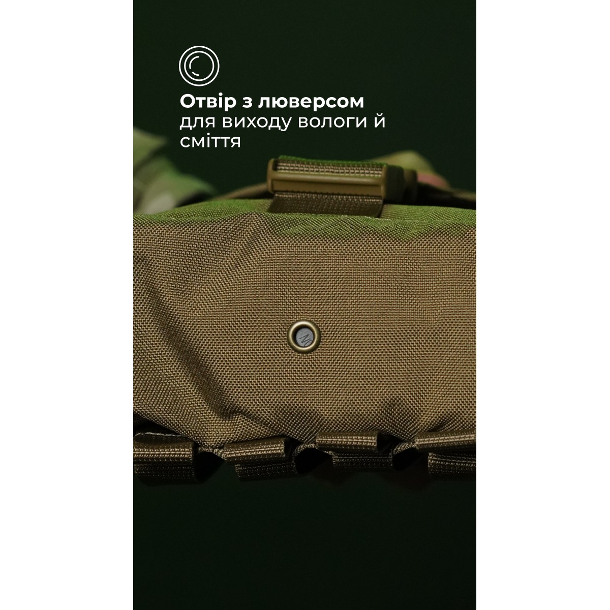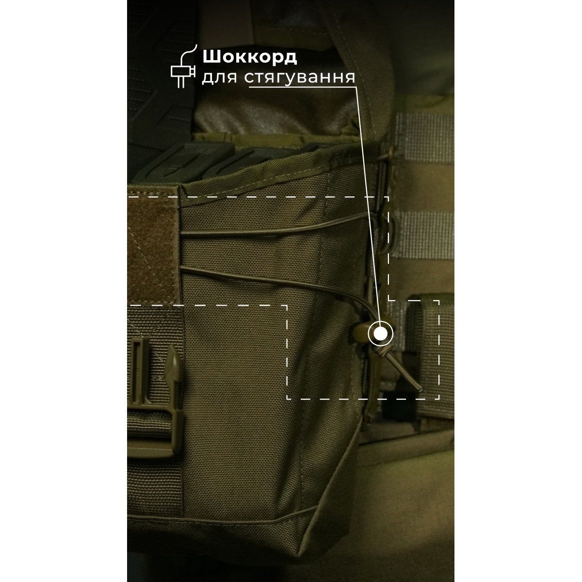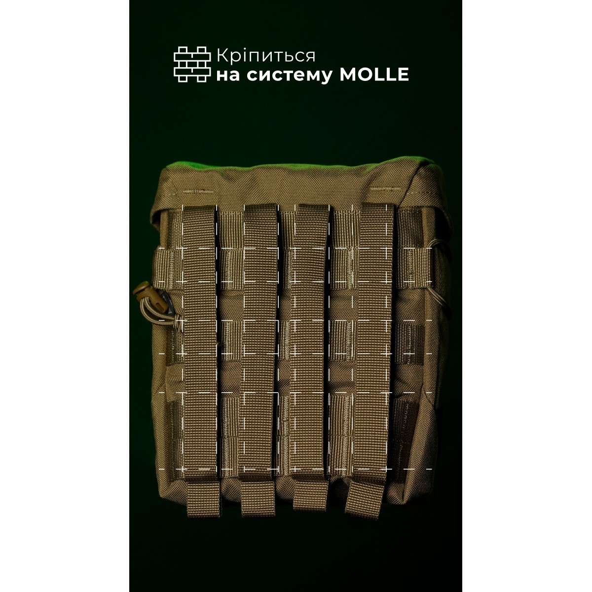 Підсумок «Стрічник» створений для перенесення короба на 200 набоїв до кулемета М249. ✅ Ключові переваги Вміщує короб на 200 набоїв калібру 5,56×45 мм Застібається на фастекс і липучку Посилені стропами боковини Прямокутна форма дає змогу швидко ставити короб будь-яким боком Може використовуватися як утилітарний підсумок Вміщує 5 магазинів AR/AK Кріпиться на моллі Стягується шоккордом для компактності Отвір з люверсом на дні для виходу вологи й сміття Витривалі матеріали – нейлон 1000D (аналог Cordura) Фурнітура WJ (Південна Корея) Опис товару Підсумок складається з єдиного відділення, яке закривається клапаном із фастексом та велкро. Липучка під клапаном закрита заглушкою на випадок, якщо ви волієте обмежитись лише фастексом. Але незалежно від того, закритий підсумок лише на липучку чи на фастекс і на липучку, він розкривається практично миттєво. Завдяки жорсткішій фіксації фастекса підсумок зручно закривати після вилучення короба навіть наосліп однією рукою – тризуб завжди перебуває у правильному положенні і його не потрібно шукати. Зсередини на боковинах нашиті стропи, які допомагають зручніше вкладати короб, підтримують форму підсумка та протистоять зношуванню. Через фасад протягнутий шоккорд для зменшення об’єму порожнього або напівзаповненого підсумка. Таким чином можна зафіксувати всередині вміст, щоб він не зміщувався і не випадав. Підсумок має прямокутну форму та не має скосів, тому короб можна розміщувати в ньому у будь-якому напрямку та носити зі зручного вам боку. Підсумок кріпиться до спорядження на систему MOLLE. Займає ширину 4 чарунок на вашому РПС чи рюкзаку. У дні вирізаний отвір із металевим люверсом, через який виходить дрібне сміття, пісок, волога. ❓ Часті запитання Чи адаптований підсумок під скошену форму короба? Ні, підсумок має прямокутну форму, без скосів. Тому не потрібно зайвий раз звіряти, чи потрібним боком ви ставите короб. Як доглядати за підсумком? Рекомендуємо прати вручну або очищувати м’якою щіткою з водою та безфосфатним порошком.Відгуки про Підсумок для короба під кулемет М249 "Стрічник" (Койот) ТМ Балістика