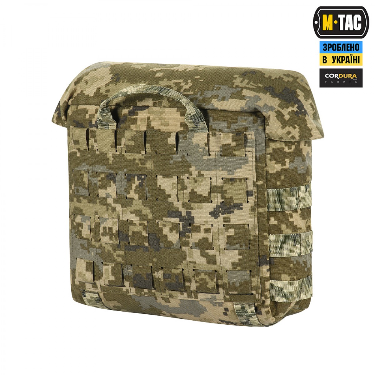 Результат кріпиться до спорядження за допомогою Molle інтерфейсу. Зверху сумки дизайнери передбачили ручку для перенесення. На клапані нашита панель для кріплення патчів та ідентифікаторів.