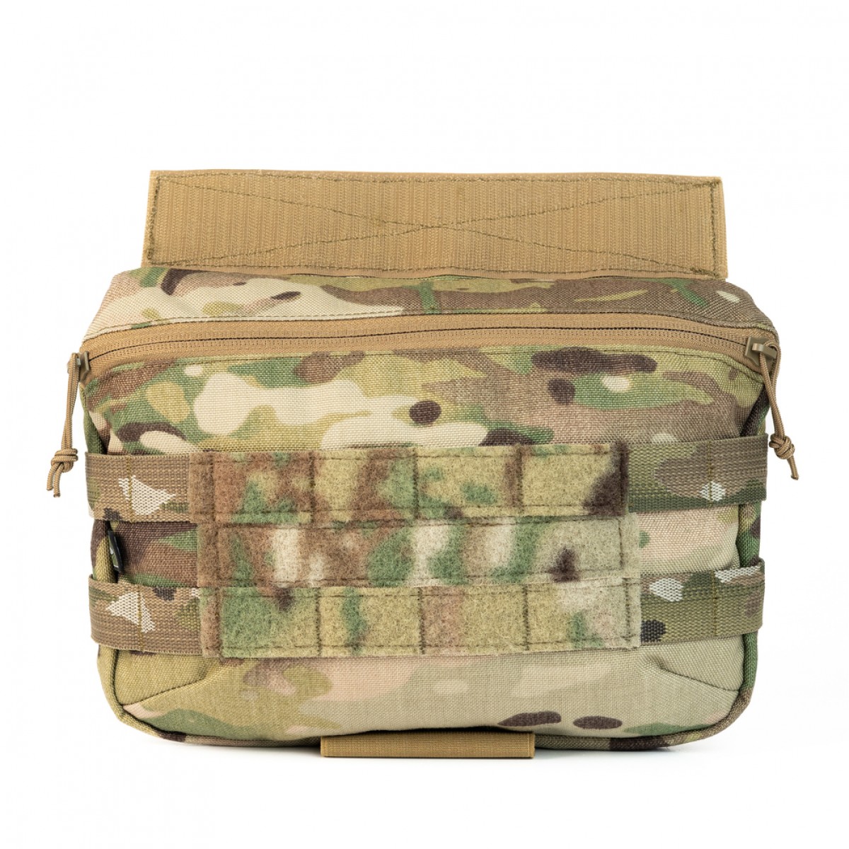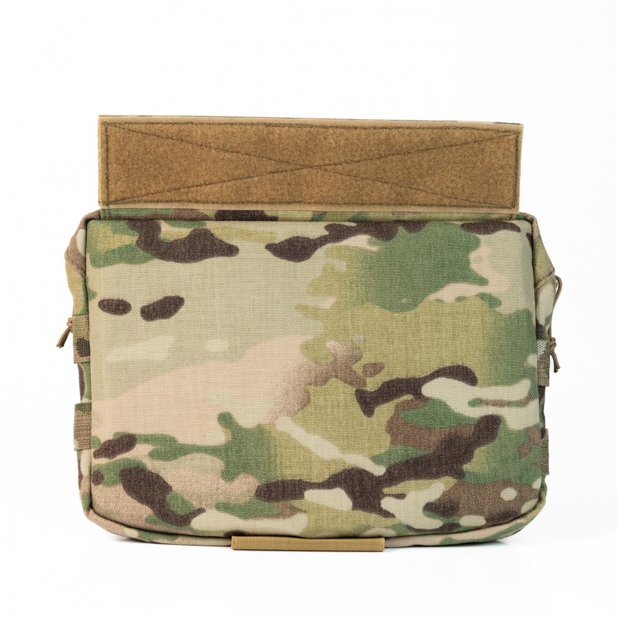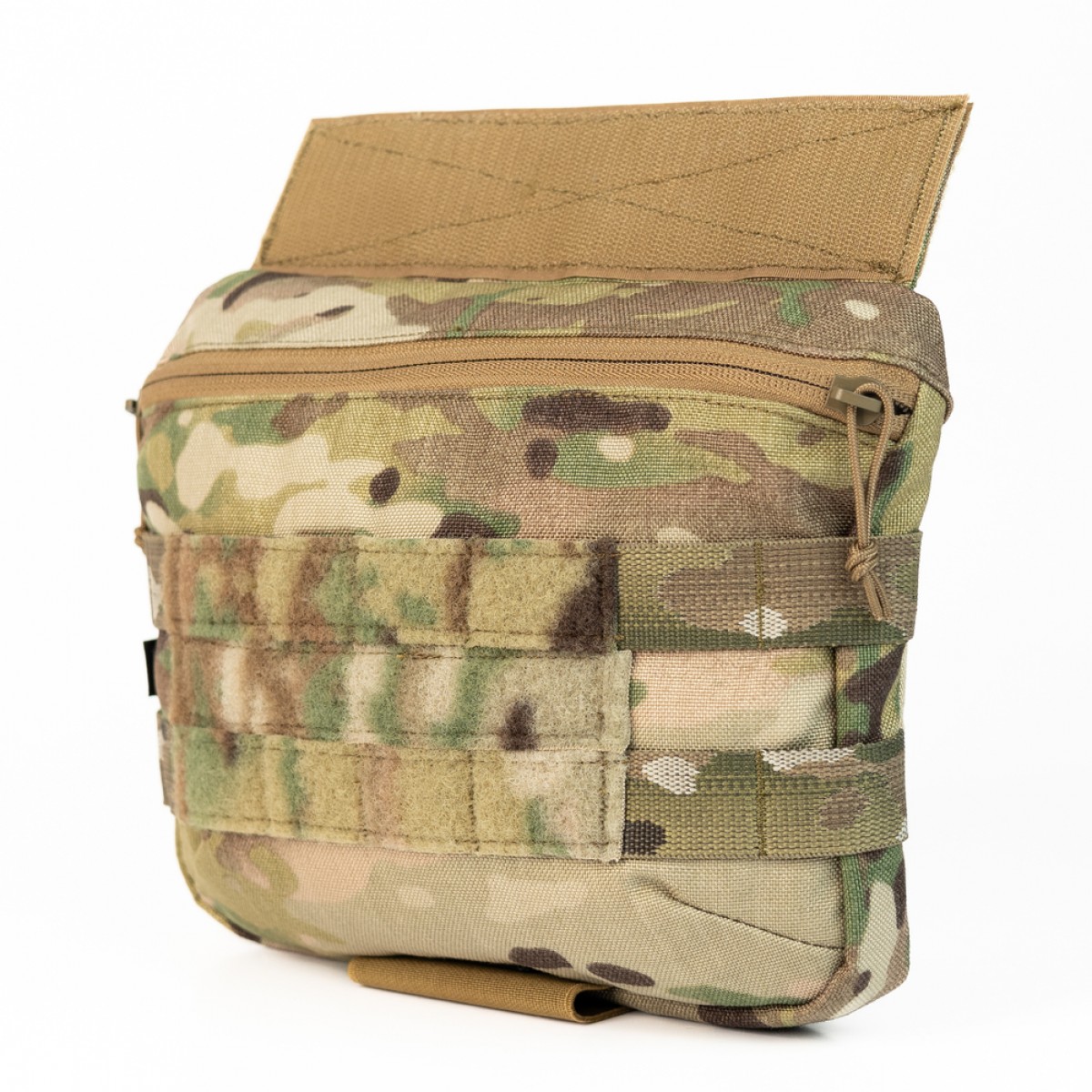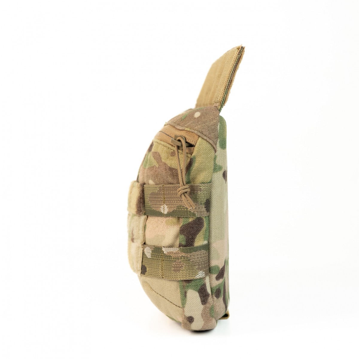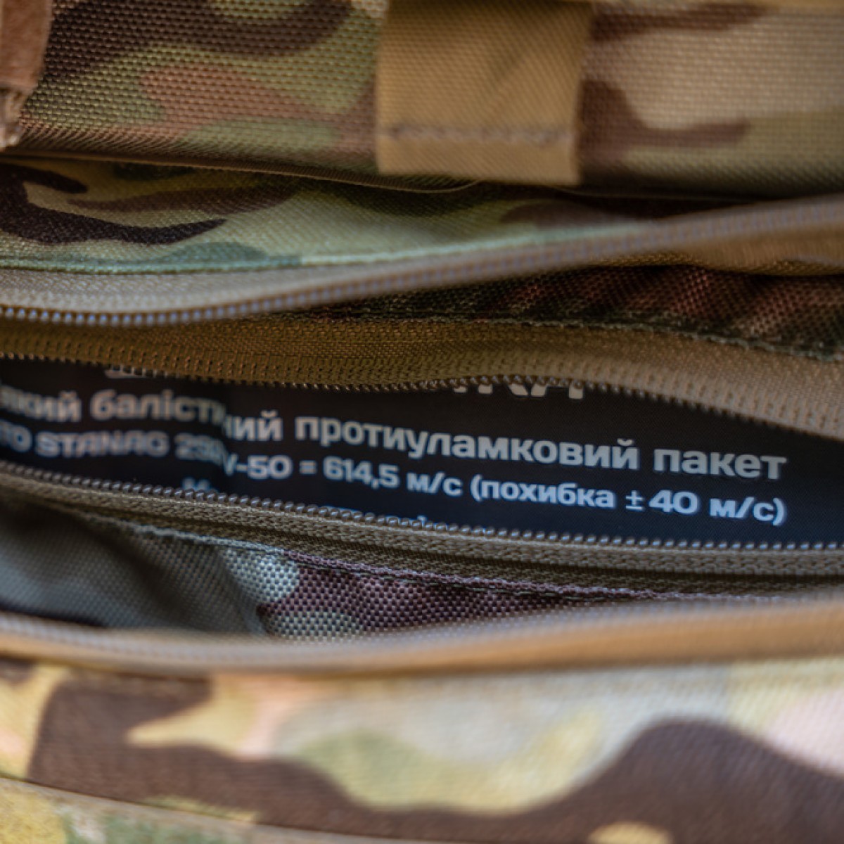 Це не просто сумка, а універсальний елемент, який можна використовувати разом із бронепакетом першого або другого класу захисту. В умовах «війни артилерій» така функція є надзвичайно важливою. «Ладник» кріпиться до плитоноски на передню або задню плиту і навіть із бронепакетом має достатньо простору для зберігання різних дрібниць. Особливості товару Завдяки своїй місткості та ергономічному дизайну сумка забезпечує зручний доступ до вмісту і водночас не обмежує у русі. Іншими характеристиками цього виробу є такі: Зверху до сумки прикріплена незнімна велкро-панель (22,5×5 см), яка вставляється у клапан плитоноски (сумісна з «Сарматом» та M3 Pro/Lite). Зверніть увагу, що на її лицьовій стороні розташовані гачки, а на тильній – петельки. Тому, якщо ваша плитоноска має інше розташування липучки, ви можете окремо придбати у нас велкро-перехідники. Виріб можна використовувати з-поміж іншого як аптечку завдяки доступу обома руками. На нижній частині міститься зовнішнє еластичне кріплення (шириною 8 см), спеціально призначене для турнікета. Основне відділення поділено на два відсіки невисокою перетинкою. Її бортик посилений смужкою пластику для надання стійкості та жорсткості. Внутрішні шви оброблені оздоблювальною стрічкою. Також тут вміщена внутрішня кишеня на блискавці, у яку і встановлюється балістичний пакет. Блискавка, якою застібається основне відділення, розташована на передній панелі сумки, на відстані 3 см від верхнього краю, що і забезпечує зручний доступ до вмісту. Два бігунки дають змогу розкривати «Ладник» на той чи той бік. На кишеню нашита еластична стрічка, розділена швами на відрізки, якими можна зафіксувати різні невеликі предмети – від додаткового турнікета або бандажа до батончиків та інших необхідних на полі бою припасів. На передній частині сумки вміщена велкро-панель з чарунками MOLLE (16×7 см). Технічні характеристики Зовнішній матеріал: Cordura 1000D. Внутрішній матеріал: Oxford 600D. Липучка: Velcro. Фурнітура: YKK. Стропа: поліамід. Розміри: 25×17×3 см. Вага: 155 г.Основні характеристики Напашник "Ладник" із суцільною велкро-панеллю (Мультикам)