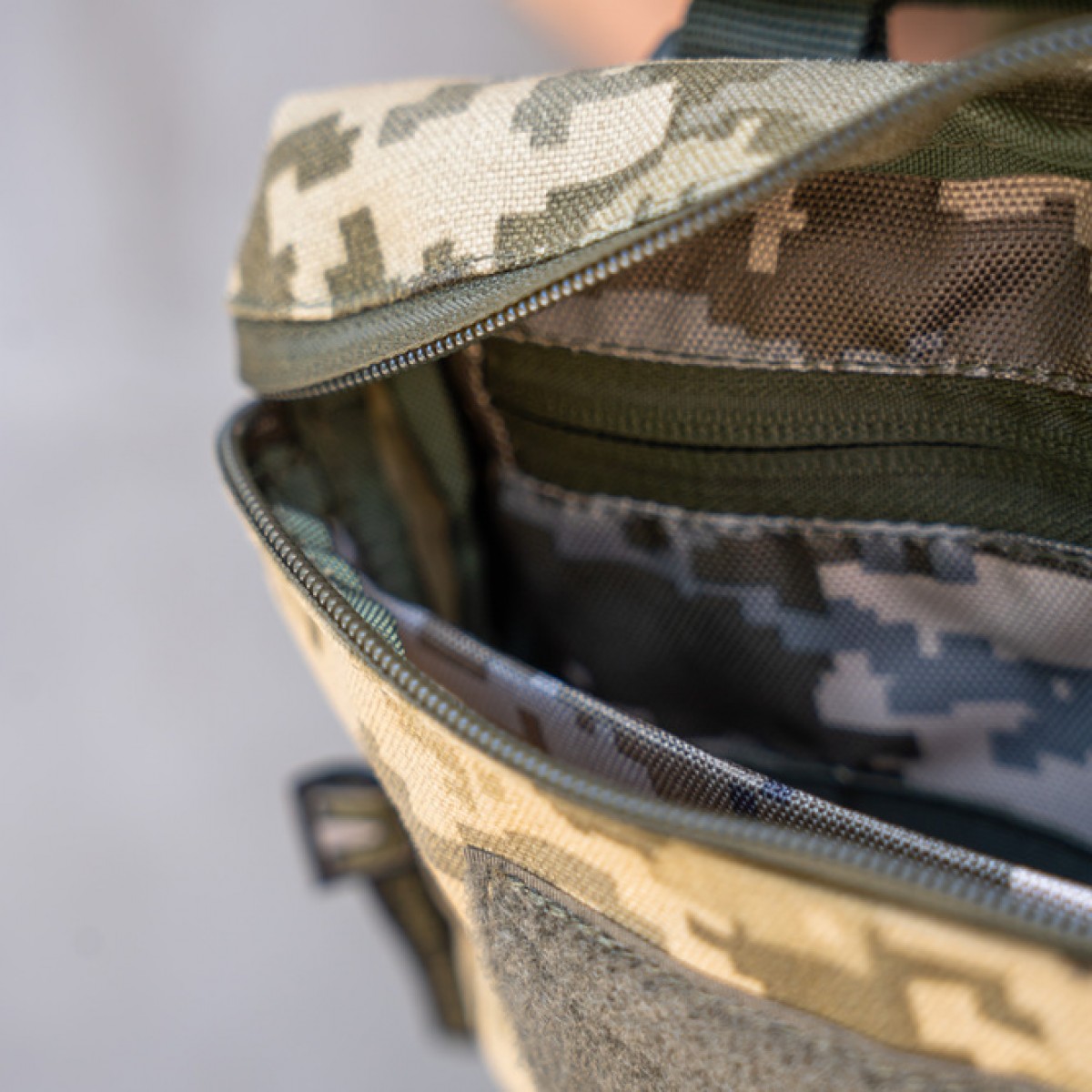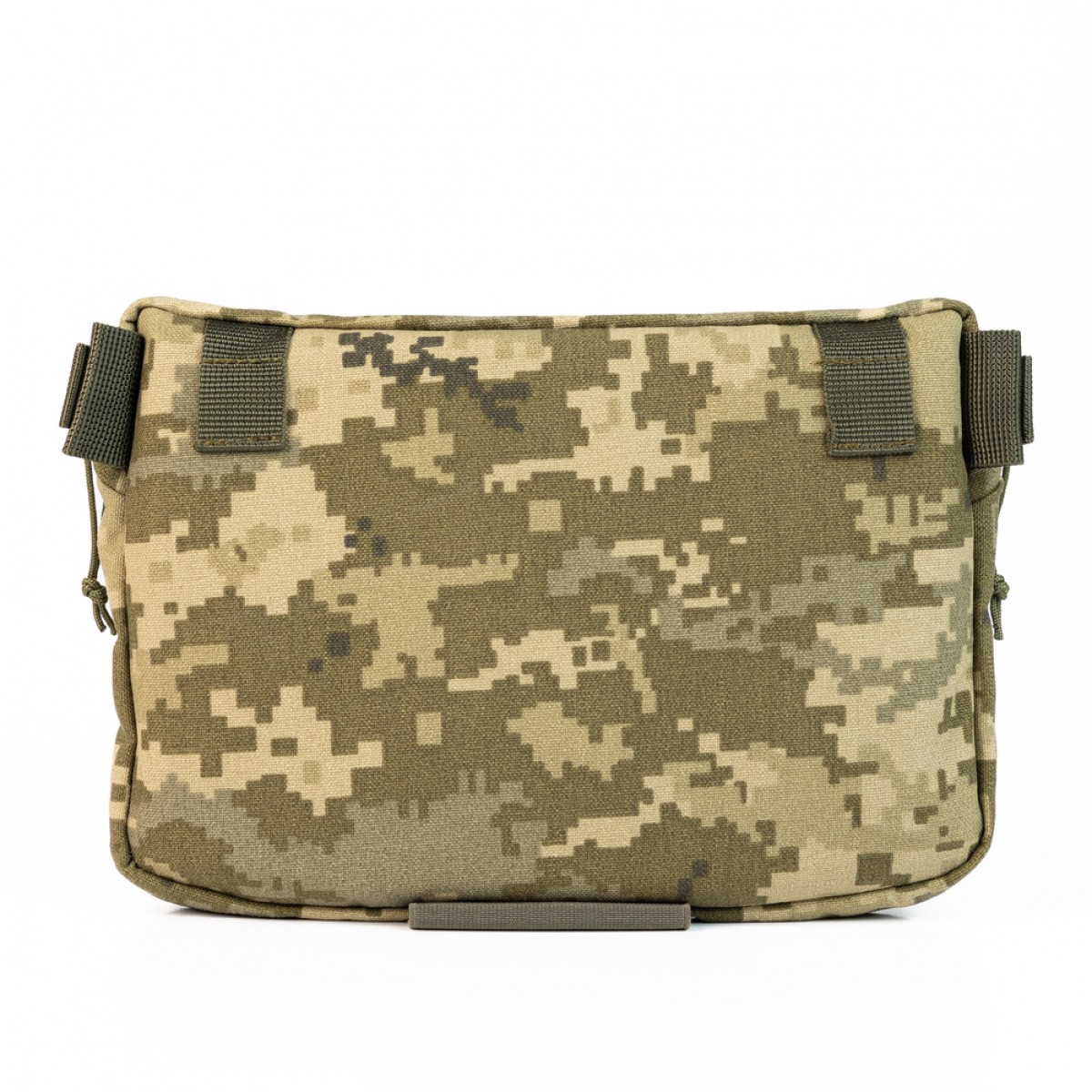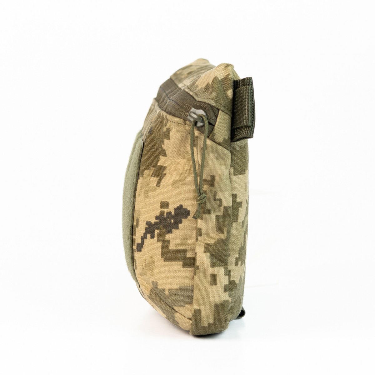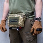 «Ладник» поєднує в собі кілька способів застосування. Він може бути напашною сумкою, яка кріпиться до плитоноски або бронежилета. При встановленні бронепакета він стає ще й повноцінним абдомінальним протиуламковим модулем захисту. А якщо до нього придбати ремінець шириною 2,5 або 4 см, то цілком можна використовувати в повсякденному житті як бананку або сумку через плече. Особливості товару Метою конструкторів компанії «Балістика» було створити сумку з можливістю встановити бронепакет першого чи другого класу захисту, який водночас не заважатиме використовувати її за прямим призначенням. В умовах «війни артилерій» це надважливо. Крім того, незамінним цей виріб роблять такі характеристики: Комплектується двома знімними велкро-кріпленнями. Частина з липучкою має довжину 10 см і вставляється у клапан плитоноски. До підсумка кріплення чіпляються на карабіни, для яких на ньому ззаду нашиті горизонтальні петлі. Дві подвійні вертикальні петлі на боках сумки призначені для ремінця (шириною 2,5 чи 4 см), який дає змогу носити її як бананку. Ремінь у комплекті не йде. Можна використовувати як медичний підсумок завдяки доступу до нього обома руками. Зовнішнє еластичне кріплення (шириною 8 см) на нижній частині дає змогу переносити турнікет. Основне відділення розділено на два відсіки невисокою перегородкою. Облямівка, якою вона обшита згори, всередині має смужку пластику для надання їй стійкості. Внутрішні шви посилені оздоблювальною стрічкою. Також тут вміщена внутрішня кишеня на блискавці, у яку і вставляється бронепакет. Блискавка, якою замикається основне відділення, розташована на передній панелі підсумка, на відстані 2+ см від верхнього краю, що і забезпечує зручний доступ до вмісту. Два бігунки дозволяють розкривати підсумок на один чи другий бік. На кишені нашита еластична стрічка, поділена швами на відтинки, у які можна повстромлювати різні невеликі речі – від додаткового турнікета або бандажа до батончиків та інших необхідних на полі бою припасів. На передній частині сумки вміщена велкро-панель з чарунками MOLLE (16×7 см). Технічні характеристики Зовнішній матеріал: Cordura 1000D. Внутрішній матеріал: Oxford 600D. Липучка: Velcro. Фурнітура: Woojin. Стропа: поліамід. Розміри: 25×17×3 см. Вага: 167 г.Основні характеристики Сумка-напашник бананка "Ладник" (ММ-14)