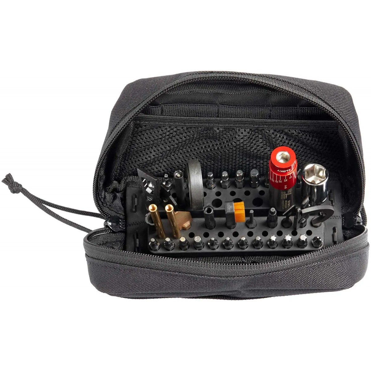 У набір Fix It Sticks The Works входять всі необхідні інструменти для догляду за зброєю в польових умовах: обмежувачі крутного моменту (65, 45, 25, 15 in-lb), T-подібний ключ з ручкою, виколотки, шкребок для чищення затвора і латунний шкребок, насадка-щіточка, ключ для корончатої гайки, торцева 1/2" насадка-шестигранник, адаптер для установки 1/4" біт, набір хромованих 1/4" біт (24 шт), адаптери для біт, латунний збірний шомпол з різьбою 8/32, насадки для регулювання і настройки мушки типу А2 і мушки Glock, універсальний ключ для установки чоків, ключ для зняття втулки в Colt 1911, міні-монтувалка і нейлоновий кейс для зберігання і транспортування з магнітною велкро-панеллю (для патчів і біт).