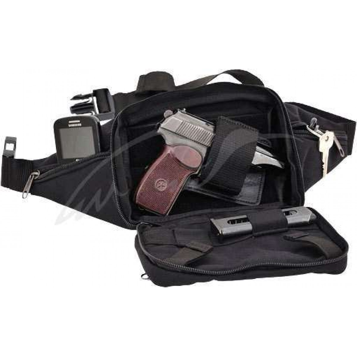 Поясна сумка-кобура призначена для прихованого носіння пістолета (ПМ, Форт або аналогічного розміру) і додаткових магазинів до нього. Ремінь застібається на фастекс.