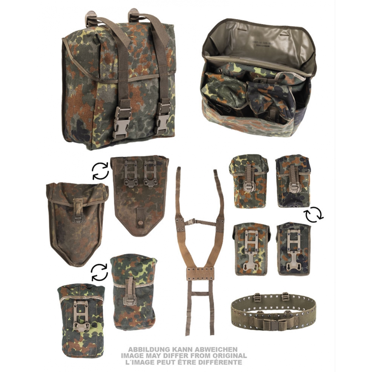 Стандартна ремінно-плечова система Бундесверу, що складається з широкого нейлонового ременя, плечових лямок, великого утилітарного підсумків, двох магазинних підсумків, підсумків під складну лопатку і підсумків під флягу.