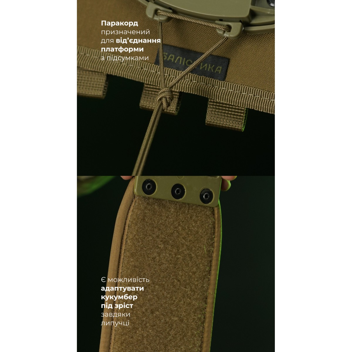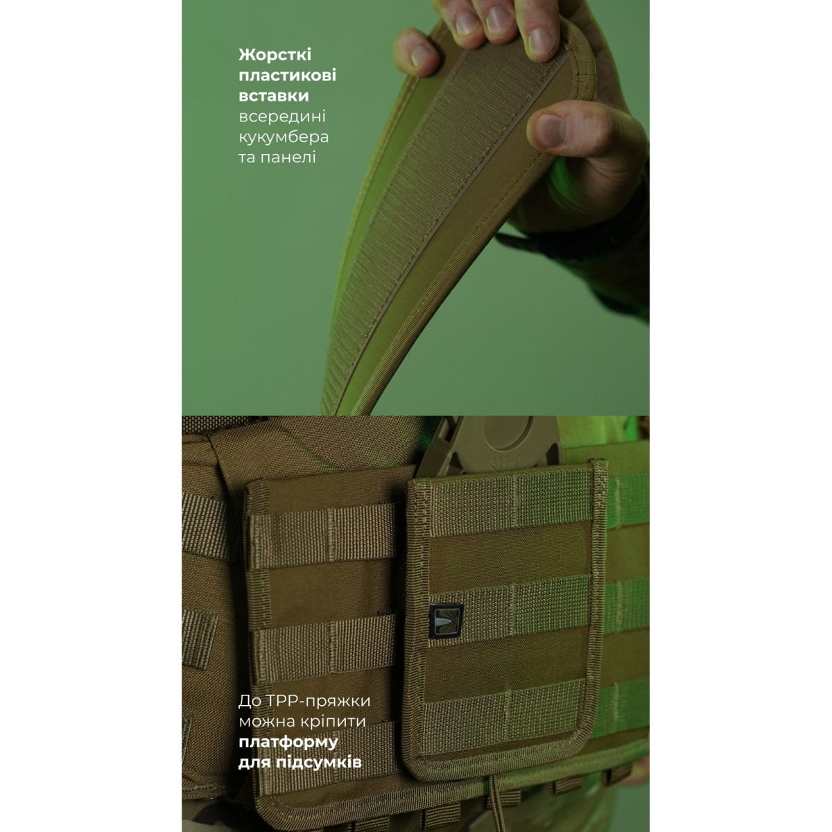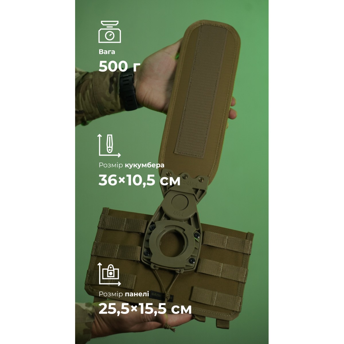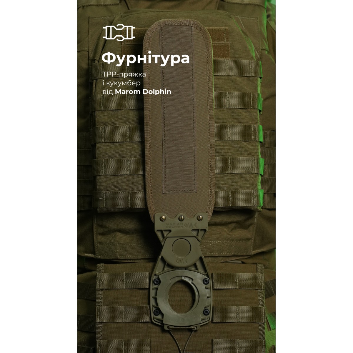 З’єднує плитоноску та РПС в єдину конструкцію, яка переносить навантаження з плечей та спини на ноги. Це зменшує втому, покращує рухливість і дає змогу довше зберігати ефективність у бою ✅ Ключові переваги Знімає навантаження з плечей та спини Можна швидко під’єднати та від’єднати спорядження Система універсальна, підходить для плитоносок і бронежилетів будь-якого виробника з нижнім доступом до бронеплити Дає змогу вільно нахилятися в боки завдяки поворотному механізму Можна адаптувати під зріст Витривала тканина – нейлон 500D (аналог Cordura) Опис товару Виріб складається з двох елементів: Пряжка TPP (Tactical Pivot Point) від Marom Dolphin, яка інтегрована в жорстку панель з нейлону та пластику Кукумбер від Marom Dolphin, на якому з однієї сторони нашите м’яке велкро, з другої – жорстке. Всередині містить пластикову вставку ✔️ Панель із пряжкою шнурується до РПС на 6 строп моллі. Спереду на ній нашиті 3 ряди чарунок моллі, на які можна прикріпити два невеликі підсумки ✔️ Пряжка має вигляд круглого роз’єму (гнізда) та розкривається за допомогою паракордової шворки. Зверху на ній передбачений поворотний механізм для вставки кукумбера ✔️ Кукумбер фіксується всередині плитоноски за допомогою велкро, після чого встановлюється в поворотний механізм пряжки ✔️ Якщо липучка на кукумбері та в клапані плитоноски несумісна, можна відкрутити знімні гвинти та переставити кукумбер потрібною стороною ✔️ Гніздо TPP призначене для кріплення платформи для підсумків на 2 чи 4 чарунки моллі, яка не входить до комплекту і яку можна придбати окремо. Вона закриває собою роз’єм і надає простір для фіксації швидкознімного підсумка ❓ Часті запитання Чи підійде система до будь-якої плитоноски? Так, система універсальна та підходить до плитоносок і бронежилетів із нижнім доступом до бронеплити. Головне – щоб клапан фіксувався липучкою. Якщо ви виявили, що у вашому бронежилеті чи плитоносці липучка не збігається з липучкою на кукумбері, ви можете відкрутити знімні болти й переставити його потрібною стороною. Чи не обмежує система розвантаження рухи? Поворотний механізм, яким оснащена система, дозволяє нахилятися в боки у діапазоні приблизно від 40° до 140°. Водночас вертіти тулубом з нею буде важче, ніж без неї. Тож умовно, щоб стріляти з-за рогу, доведеться напружитись. Однак на довгих переходах з точки А в точку Б ця річ незамінна. Чи можна від’єднати систему в польових умовах? Так. Завдяки кнопці на поворотному механізмі можна одним рухом від’єднати кукумбер від панелі. Це дасть змогу зняти РПС чи плитоноску або і те, і те. Як діє система розвантаження Marom Dolphin? Кукумбер підіймає задню плиту бронежилета чи плитоноски. А панель із TPP-пряжкою, пришнурована до РПС, виступає як опора для кукумбера та бере на себе навантаження. Як зрозуміти, що кукумбер встановлено правильно? Після того як ви встановили кукумбер у клапан заднього чохла для плити, надягніть бронежилет і з’єднайте кукумбер із поворотним механізмом. Правильна посадка – якщо між плечовою лямкою і плечем виник просвіт (0,5-1 см), отже, задня плита піднята і спина розвантажена. Якщо просвіту нема – треба підняти плиту вище. При цьому опускатиметься передня плита, у такому разі потрібно підтягнути лямки. Як система працює з корсетними плитоносками? У корсетних плитоносках задня та передня частини з’єднані жорстк