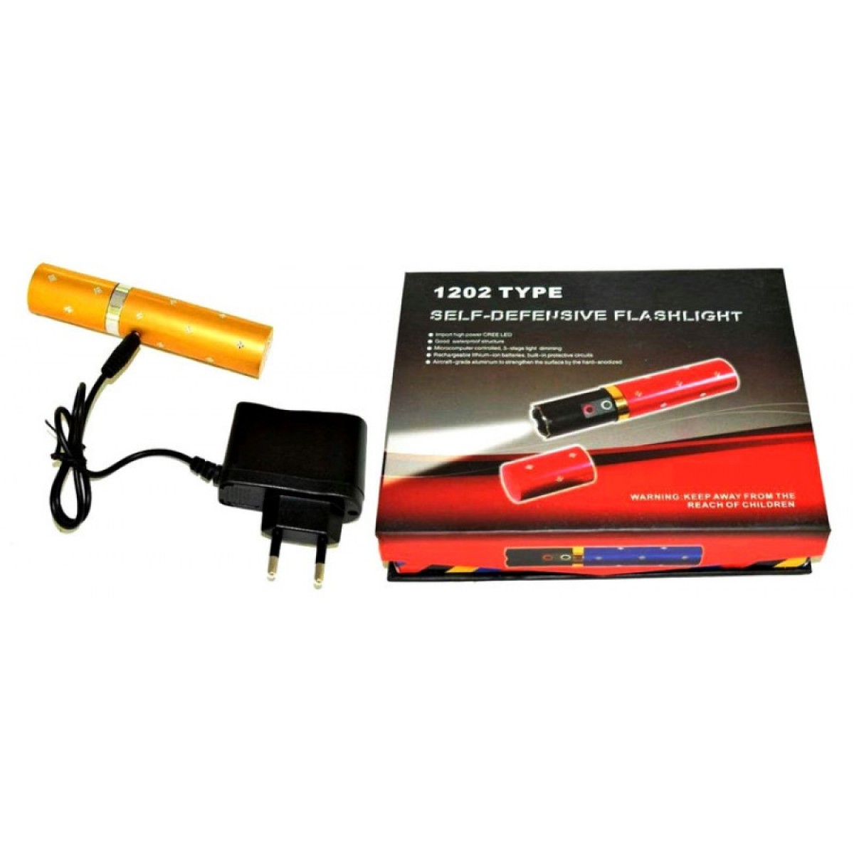 Електрошокер Помада 1202 це унікальна жіноча модель шокера. Він виготовлений у формі губної помади, має дуже стильний зовнішній вигляд. Корпус електрошокера зроблений в алюмінієвій оболонці, яка покрита золотою, червоного, рожевого або синьою фарбою. Зверху є прикраси нагадують каміння Сваровськи. Є знімний ковпачок, який оберігає від випадкового натискання на кнопку електрошокера.
