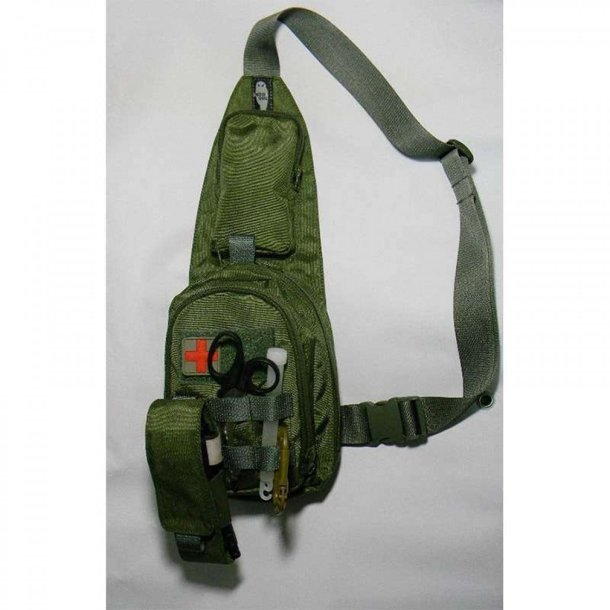На зовнішній стороні сумки нашита панель велкро для розміщення парчей та ідентифікаторів. Нижче нашиті два ряди стрічок MOLLE.
