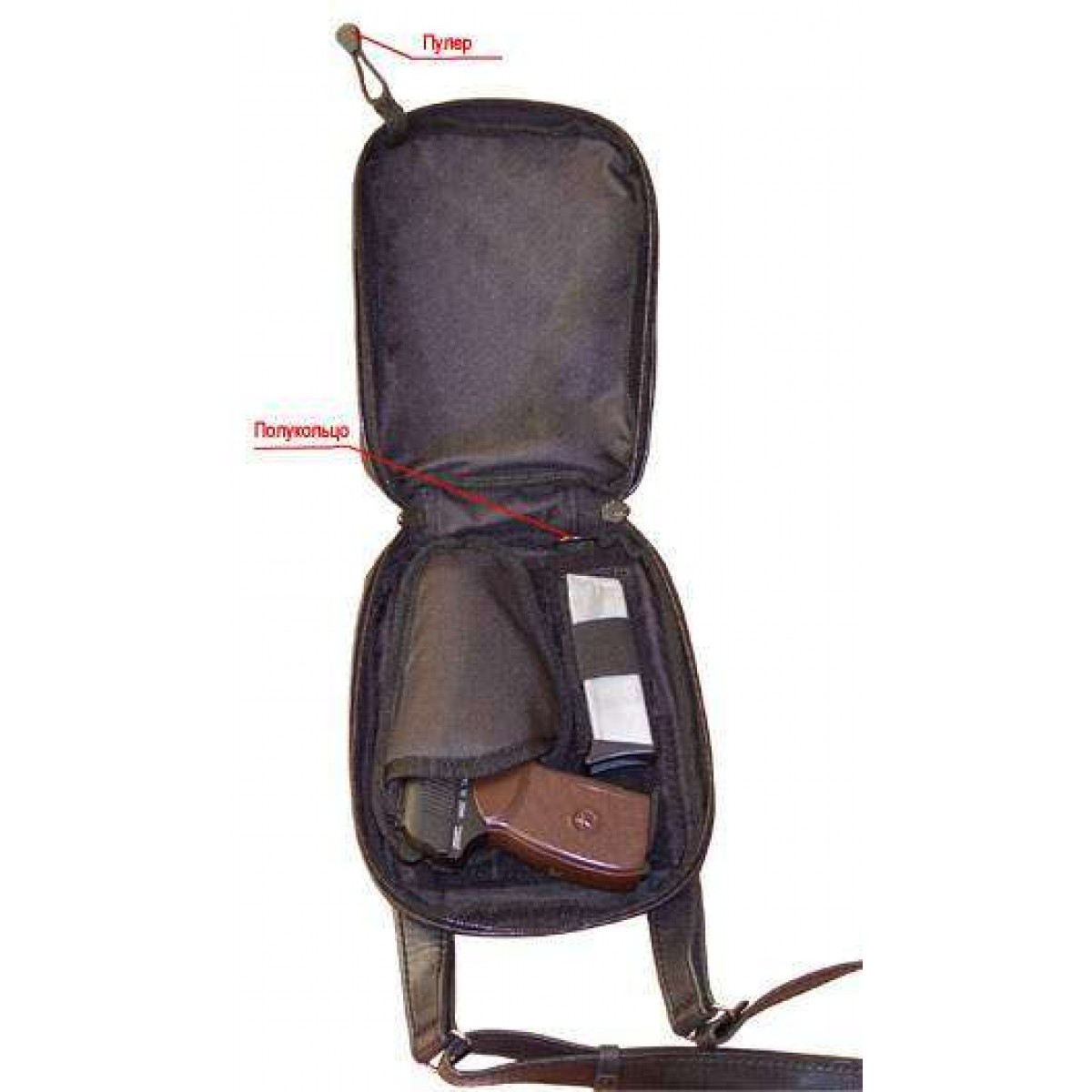 Виготовлена з високоякісної натуральної шкіри. Призначена для прихованого носіння пістолетів і револьверів ПМ, Форт 10Р, Форт 12, Форт 17, Глок 17, Глок 19, РР, ПГШ 790, Єрма 459, Альфа 420, Сиг-Зауер, Агент, Покет та інших. Може носитися, як на плечі, так і на поясі. При носінні кобури-сумки на поясі, лямку можна зняти. У цьому випадку сумка кріпиться на підвісці. Підвіска пришита до сумці, тому навіть у випадку силового контакту зірвати сумку з пояса практично не можливо. Така конструкція не заважає зручно розташовуватися з сумкою на стільці. Вона не заважає, не впирається в стегно. Розміри відділення для зброї становлять 210х160х40. У ньому знаходяться півкільце - для кріплення страховки, кобура, подсумок для запасного магазина і пулер для екстреного відкриття сумки. На передній стінці розташований накладна кишеня. Його розміри 175х140х40. Кишеня має два відділення і бічні стінки. Туди можна покласти паспорт, права, ключі, сигарети, гроші і т. д. тобто він досить ємний. На передній стінці накладного кишені розташований врізний кишеню. Там може розташовуватися дозвіл на зброю. Всі відділення кобури-сумки і врізний кишені застібаються на блискавку. Конструкція сумки забезпечує можливість її екстреного відкривання для швидкого вилучення зброї. Для цього використовується пулер. Він розташовується зовні у верхньому куті сумки. Притримуючи кобуру-сумку лівою рукою, необхідно правою рукою різко потягнути за пулер вниз - в сторону.