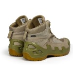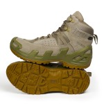Верх – комбінований, виконаний із міцної нубукової шкіри. Вона має високу повітропроникність, але одночасно захищає від попадання вологи всередину. Нубук доповнений міцною тканиною CORDURA. Завдяки такій конструкції полегшується вага взуття, що добре впливає на комфорт носіння. Підкладка взуття – дихаюча, виконана з якісного поліестеру. Окремо варто згадати про 100% водонепроникну, дихаючу мембрану DryTex. Вона ефективно відводить випари тіла, підтримуючи цим природний теплообмін. Таким чином, навіть при тривалому активному носінні, ноги будуть у максимальному комфорті. Метод кріплення підошви – литтєвий. Глибокий протектор забезпечує високу чіпкість на різних типах поверхні – асфальт, каміння, ґрунт, трава, пісок тощо. Нижня частина підошви виготовлена з гуми NUBES I-RUBBER, що має високі антиковзкі властивості. Черевики захищені від зношування напливами підошви в носку, бічних та задній частині. Висока шнурівка на петлях щільно фіксує черевики на ногах. У задній частині горловини передбачена петля, що дозволяє зручно взуватися без допомоги ложки.