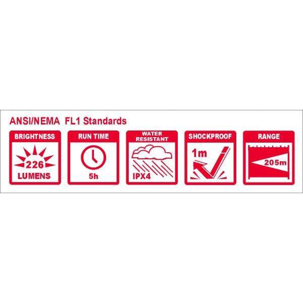 - Дальність ефективного освітлення: 205м / 226 люмен, 71м / 44 люмен